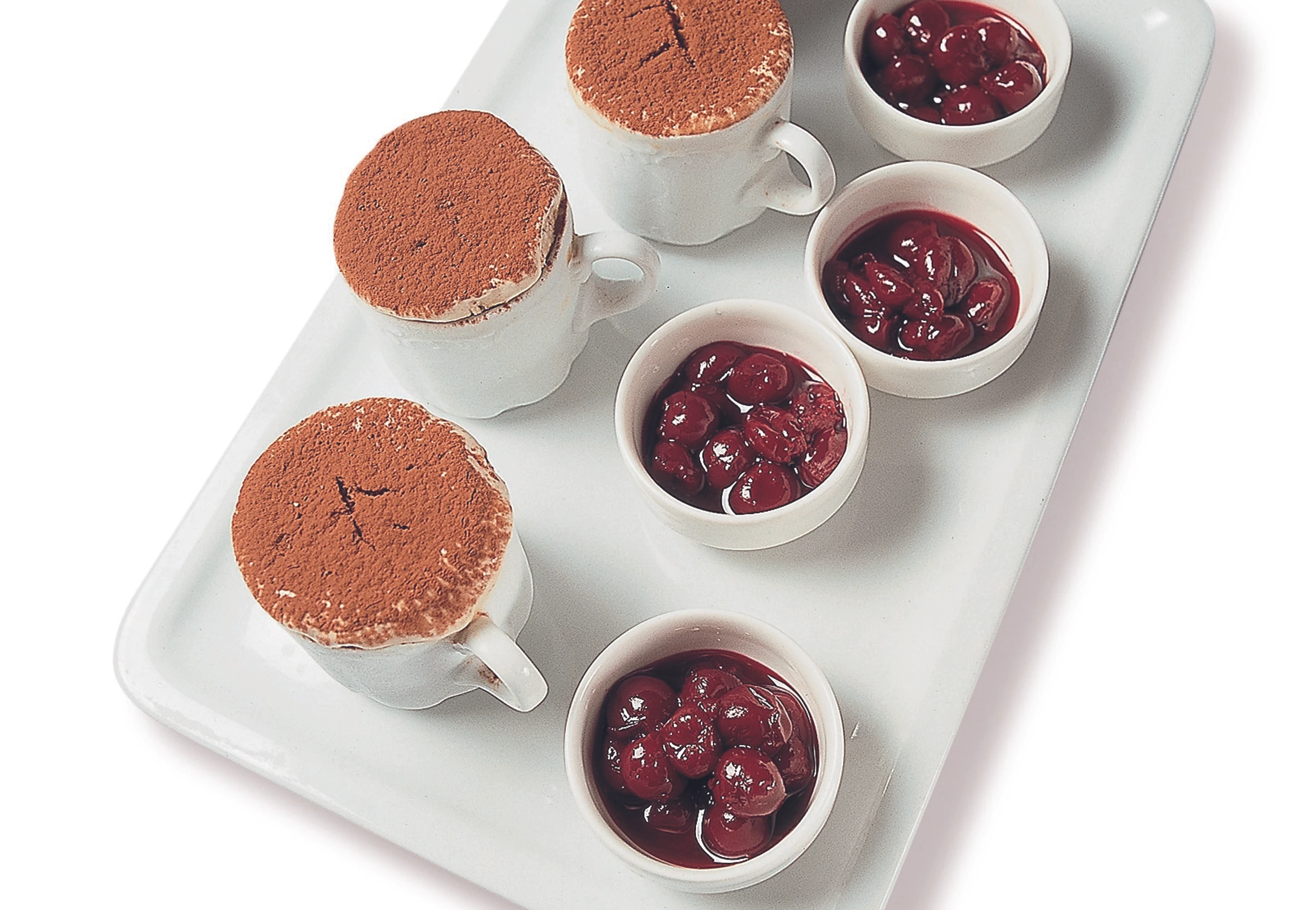 Masse in Tassen füllen und ca. 3 Stunden gefrieren. Die Parfaits mit Kakao bestreuen und mit dem Kirschenkompott servieren.