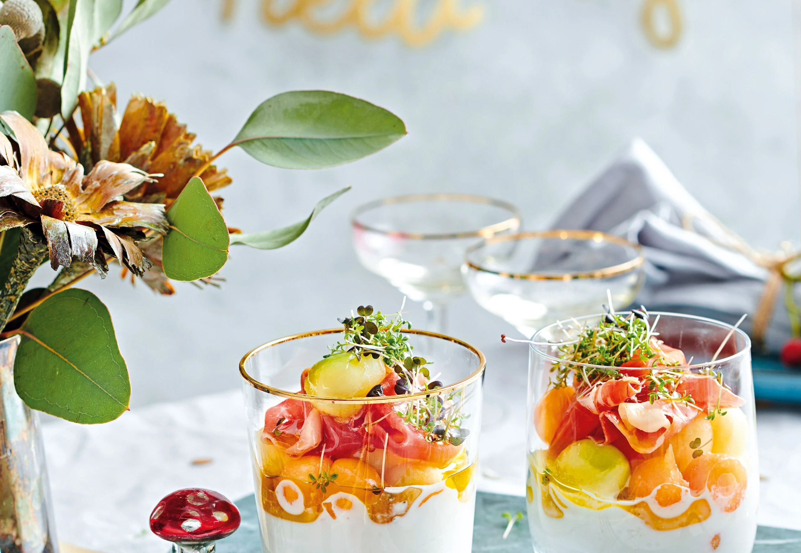 Melonen, Prosciutto, Kresse und Olivenöl in den Gläsern verteilen. Mit 1 Prise Meersalz würzen.