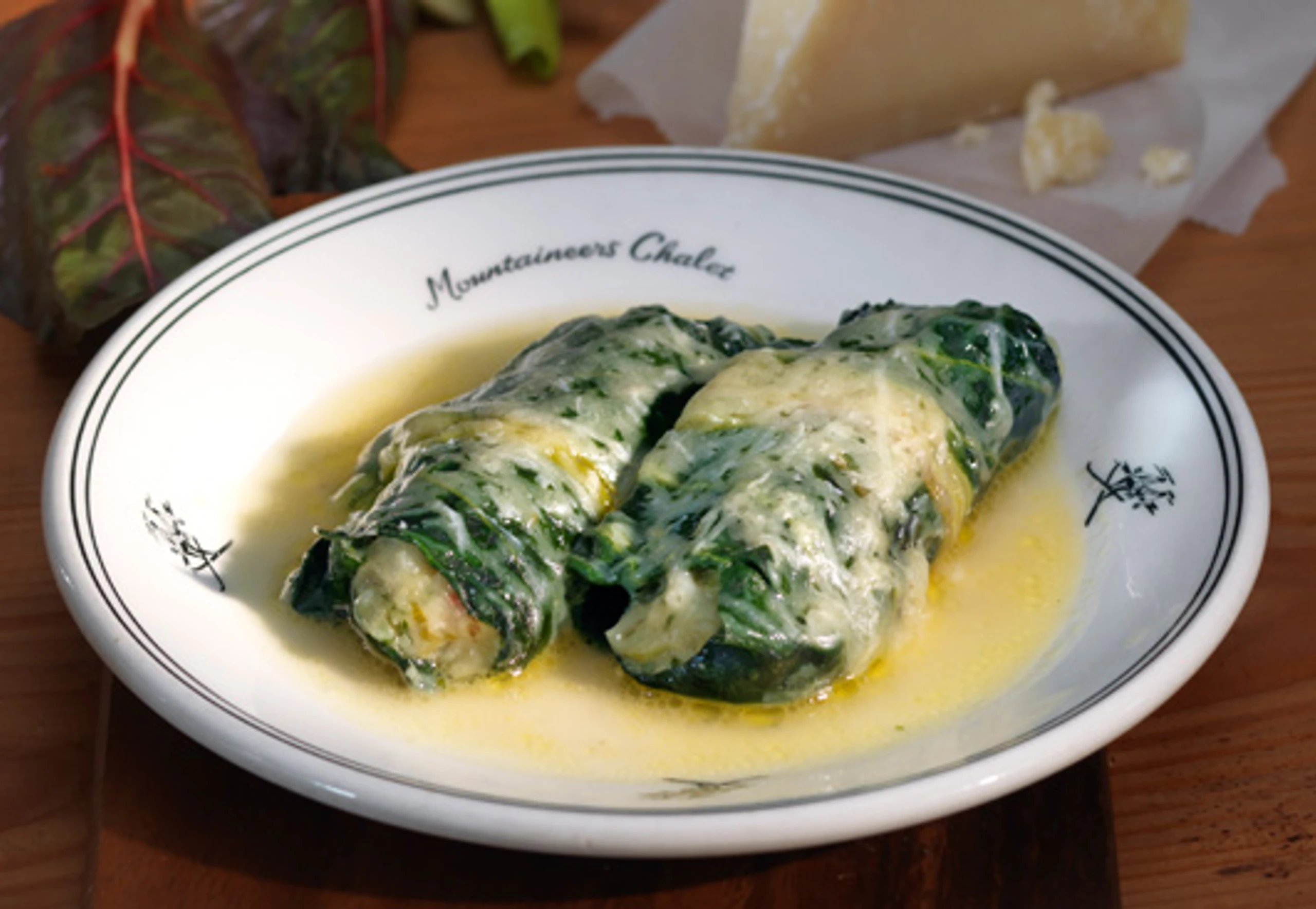 - Mangoldröllchen in eine weite Pfanne legen, mit heißer Suppe übergießen, Butter in Stücke schneiden und darauf verteilen. Capuns zugedeckt im Rohr (mittlere Schiene / Gitterrost) ca. 20 Minuten dünsten. Capuns mit Käse bestreut anrichten.