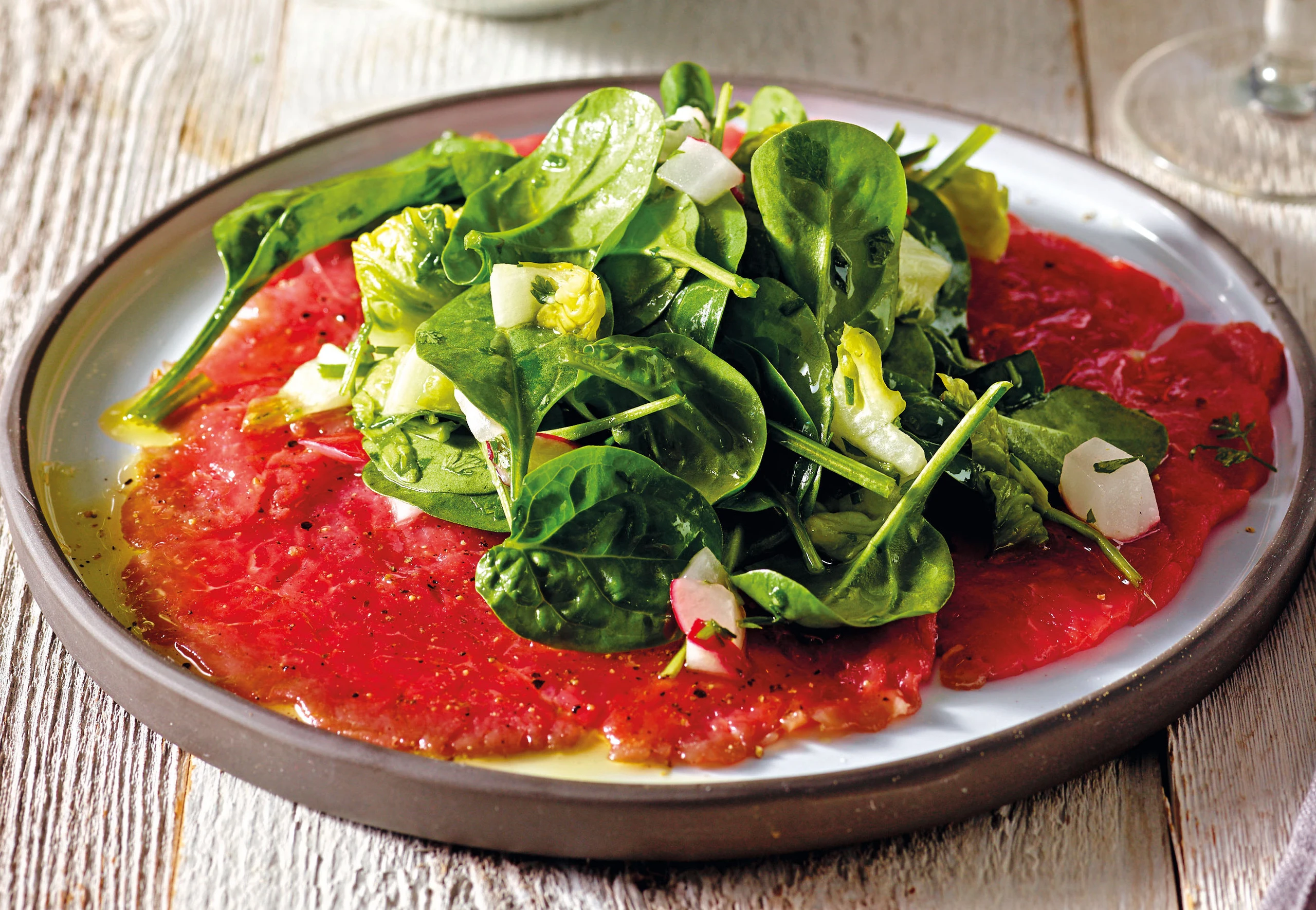 Carpaccio vom Rind mit Spinat-Kräutersalat