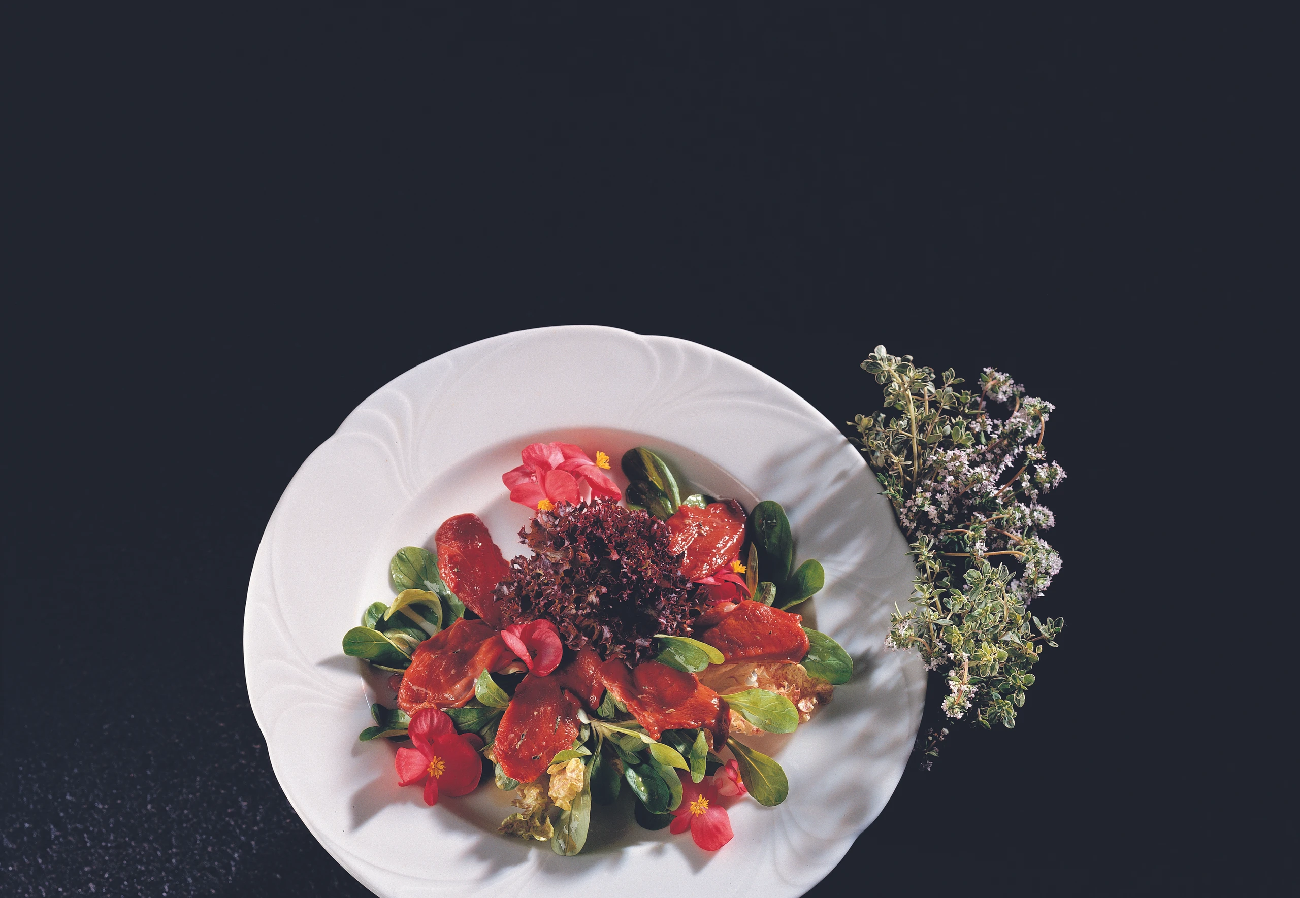 Blattsalate mit der Salatmarinade beträufeln, behutsam vermischen, auf die Teller legen und mit den Begonienblüten dekorieren. Fleischscheiben durch die Kräuter-Marinade ziehen und auf dem Salat anrichten.