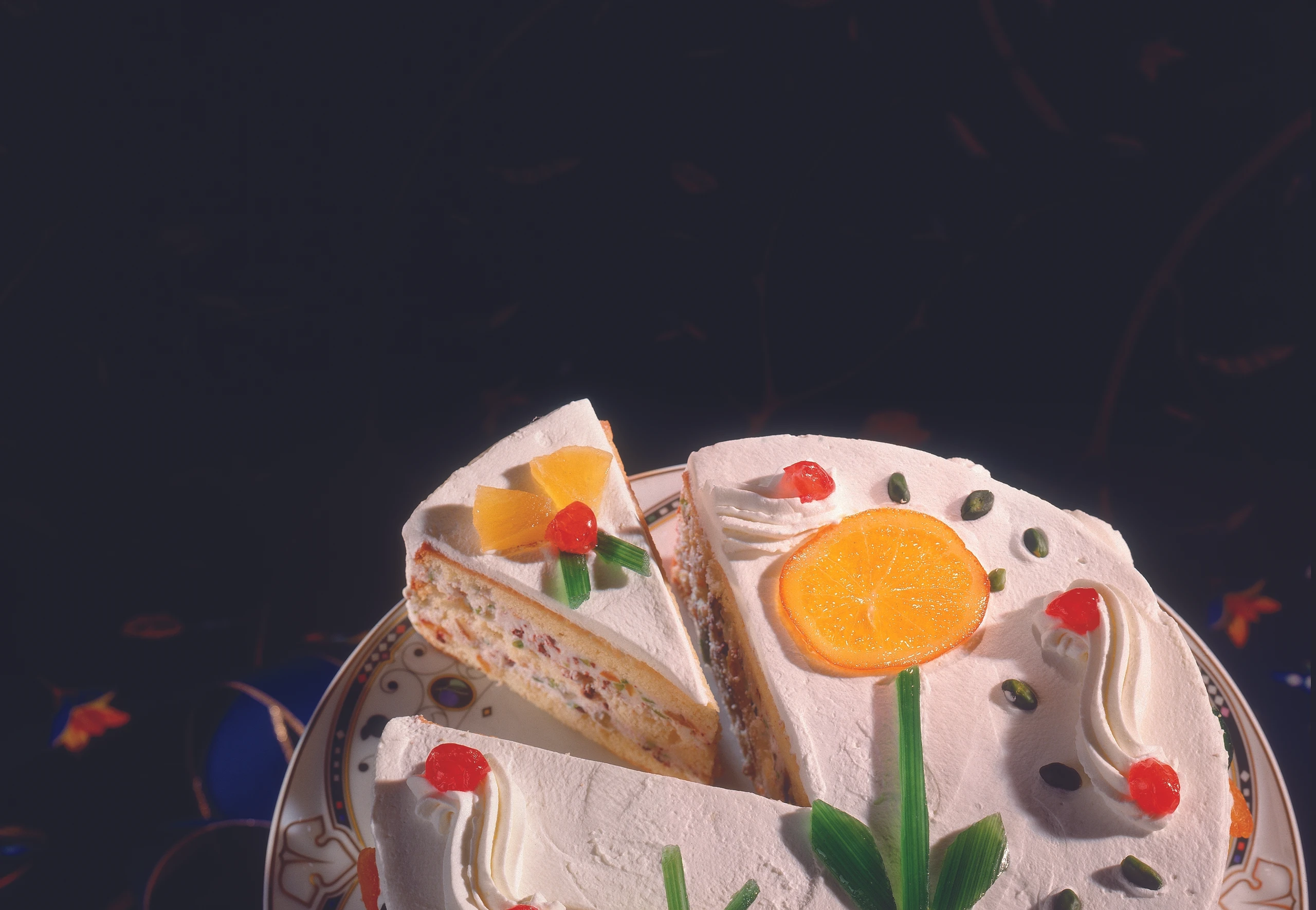 Für die Garnitur kandierte Früchte in beliebige Stücke schneiden. Obers mit Zucker und Sahnesteif schlagen. Torte aus der Springform lösen und mit zwei Dritteln vom Obers rundum einstreichen. Das restliche Obers in einen Dressiersack (mit Sterntülle) füllen. Torte mit Früchten und Obers dekorieren.