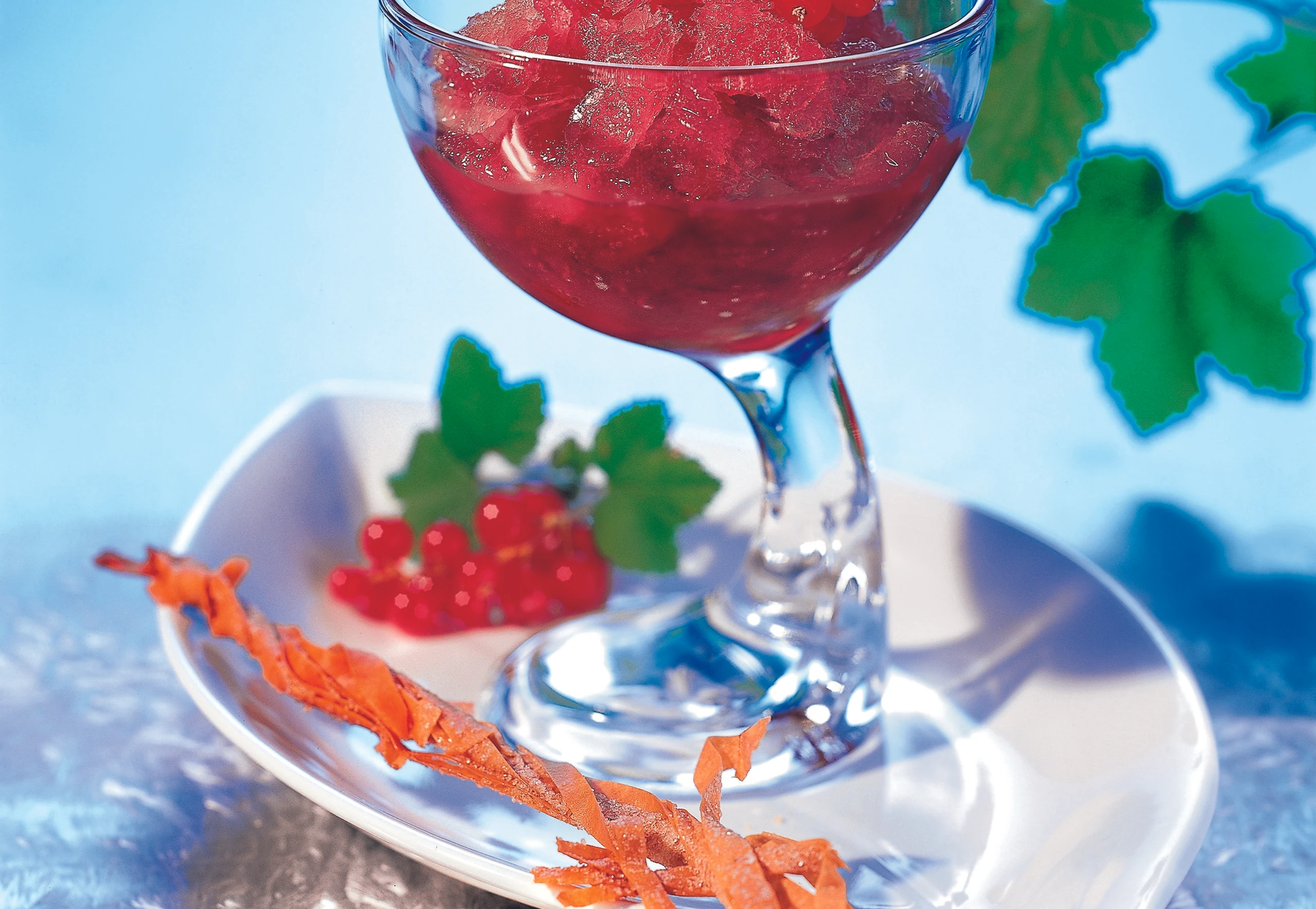 Anrichten: Das Granite mit einem Löffel aus dem Gefäß schaben, in Gläser füllen und mit Ribiseln oder Johannisbeeren garnieren.