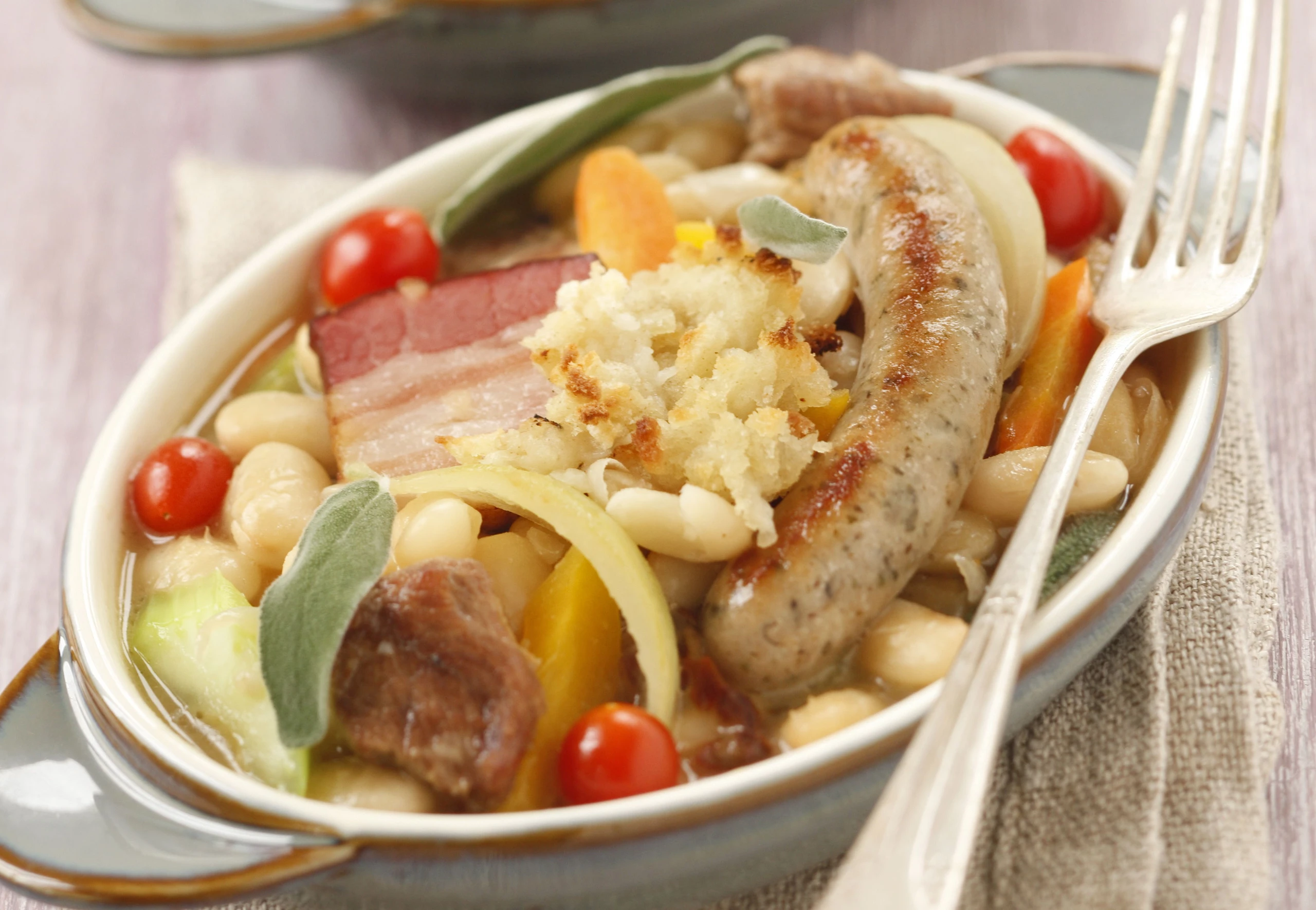 Backrohr-Temperatur auf 200°C erhöhen. Cassoulet in Portions-Gratinformen verteilen, Paradeiser und Salbei zugeben. Mit der Hälfte der Weißbrotbrösel bestreuen, im Rohr (obere Schiene / Gitterrost) ca. 4 Minuten knusprig überbacken. Brösel untermischen, Cassoulet mit den restlichen Bröseln bestreuen und goldbraun gratinieren.