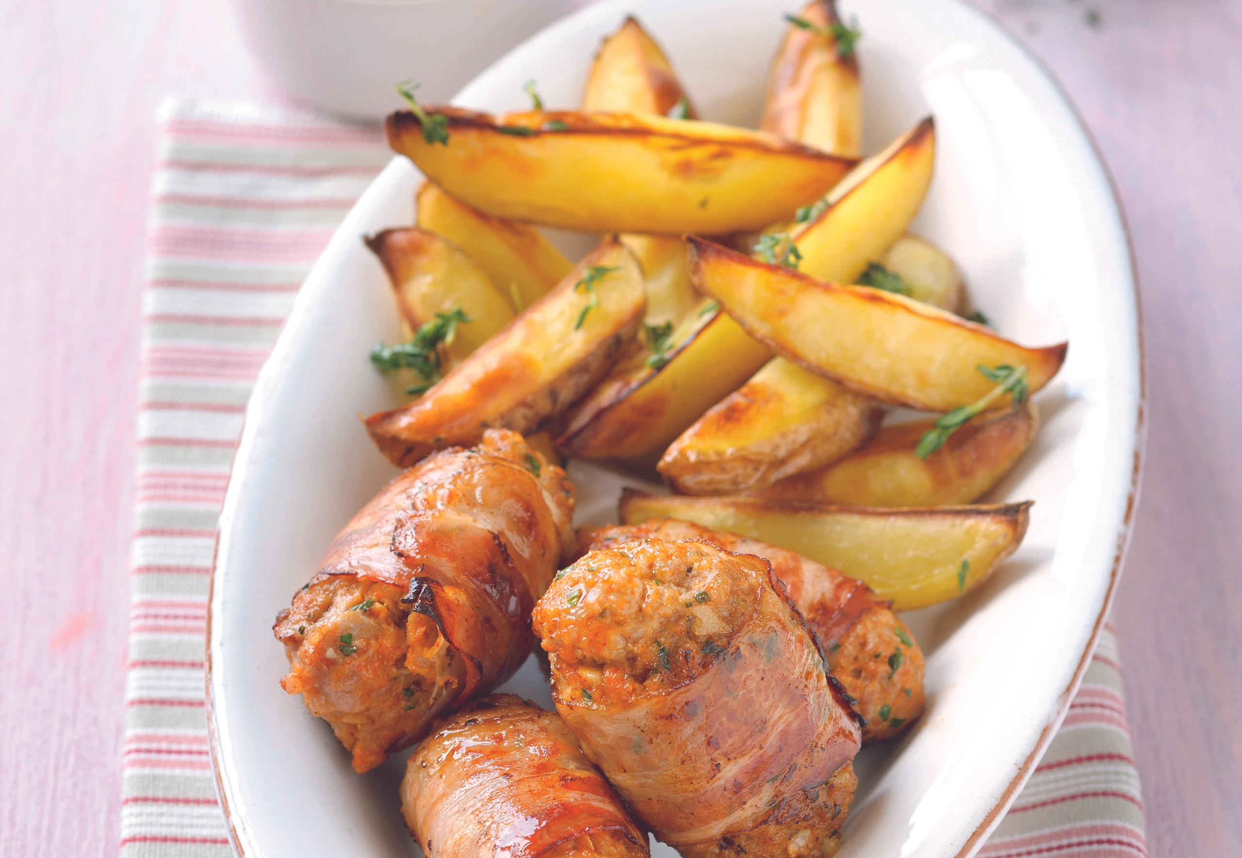 Faschiertes mit zerdrücktem Knoblauch, Paprikapulver, Petersilie, 1 TL Senf und 2 EL Bröseln vermischen, salzen und pfeffern. Aus der Masse 12 Röllchen formen und mit Speck umwickeln. Röllchen in wenig Öl rundum goldbraun braten. Cevapcici herausnehmen, mit Ragout und Erdäpfeln anrichten.