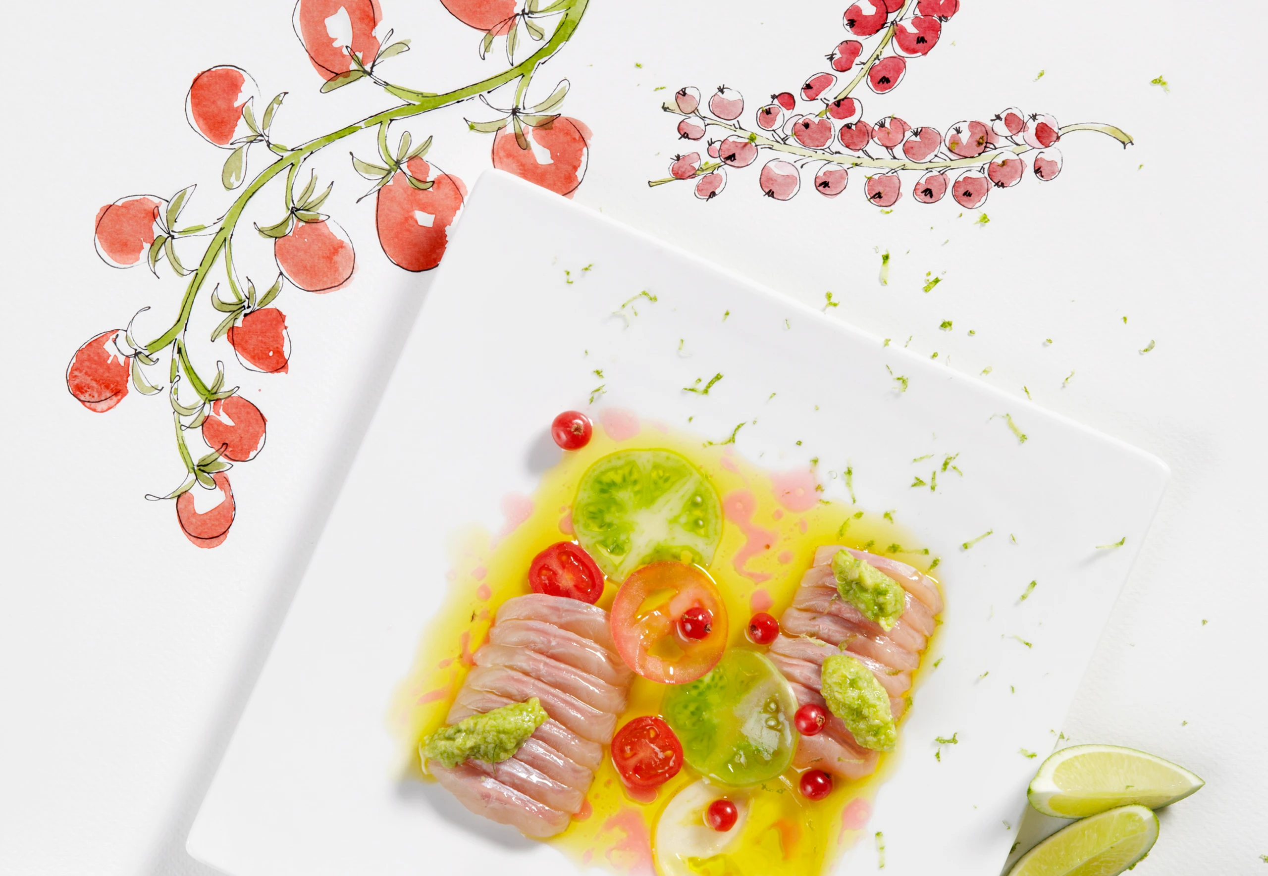 - Marinierte Filets auf Tellern anrichten, mit den marinierten Paradeisern anrichten, mit restlichem Olivenöl beträufeln. Aus der Avocadocreme Nockerln formen und auf den Fisch setzen. Mit Ribiseln garnieren.