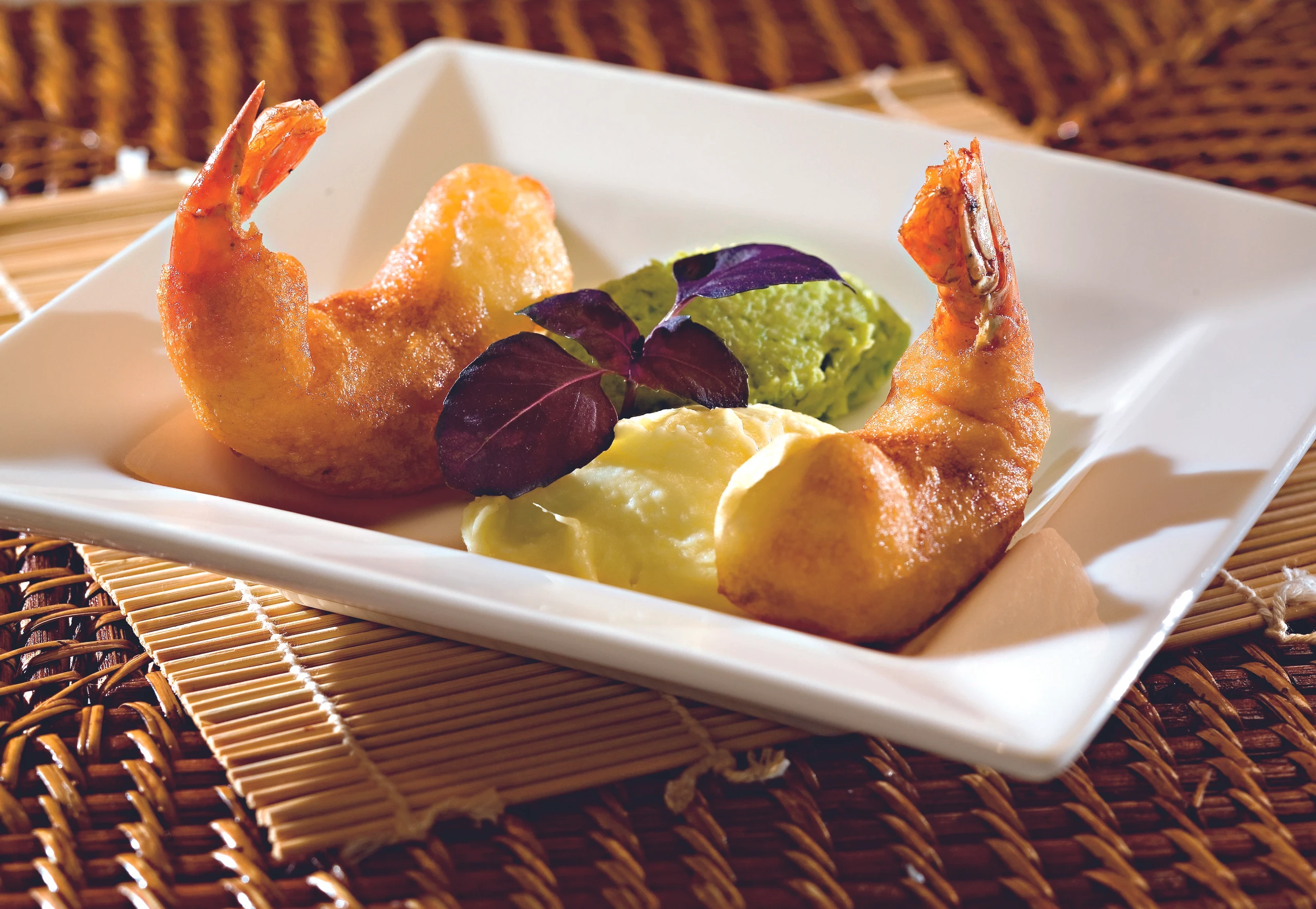 Garnelen durch den Teig ziehen, in heißem Öl knusprig goldbraun backen und abtropfen lassen. Garnelen mit den Spargelpürees servieren.