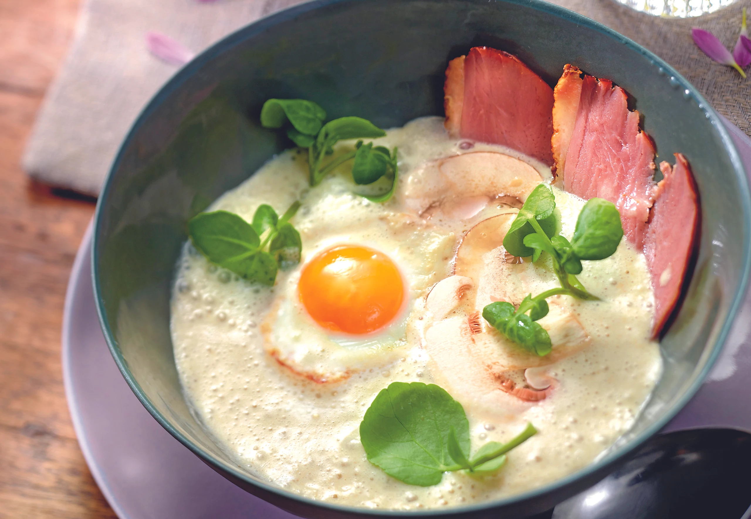 Champignon-Cremesuppe mit Entenbrust und Wachtelei