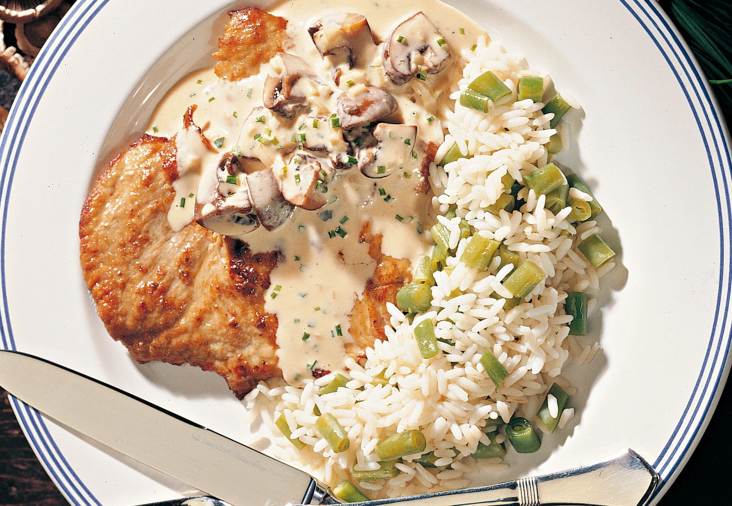 Champignonschnitzel mit Fisolenreis