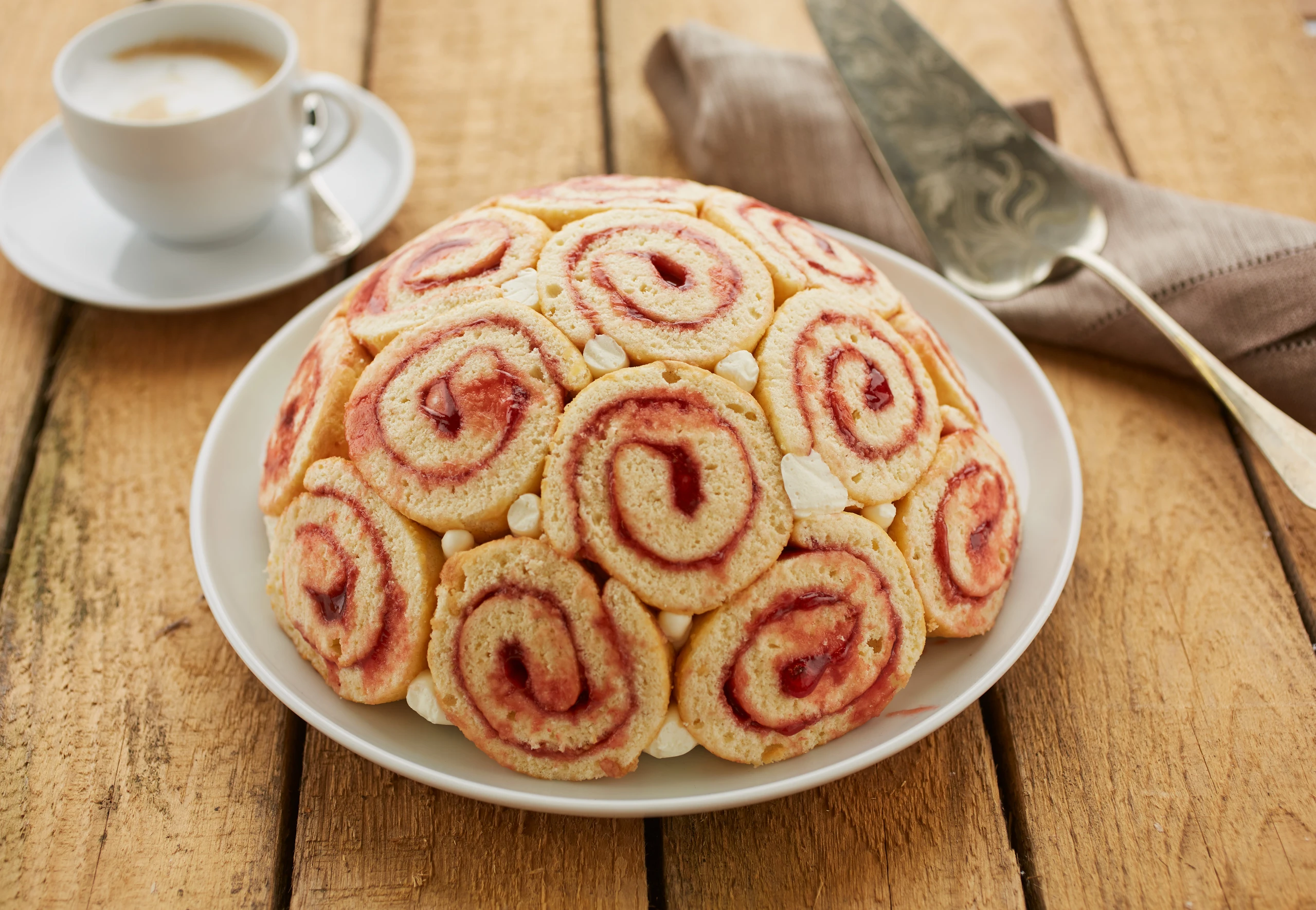 Eine Schüssel (Inhalt 2,5 l) mit Frischhaltefolie auslegen. Roulade in ca. 20 Scheiben schneiden und die Form eng damit auslegen.