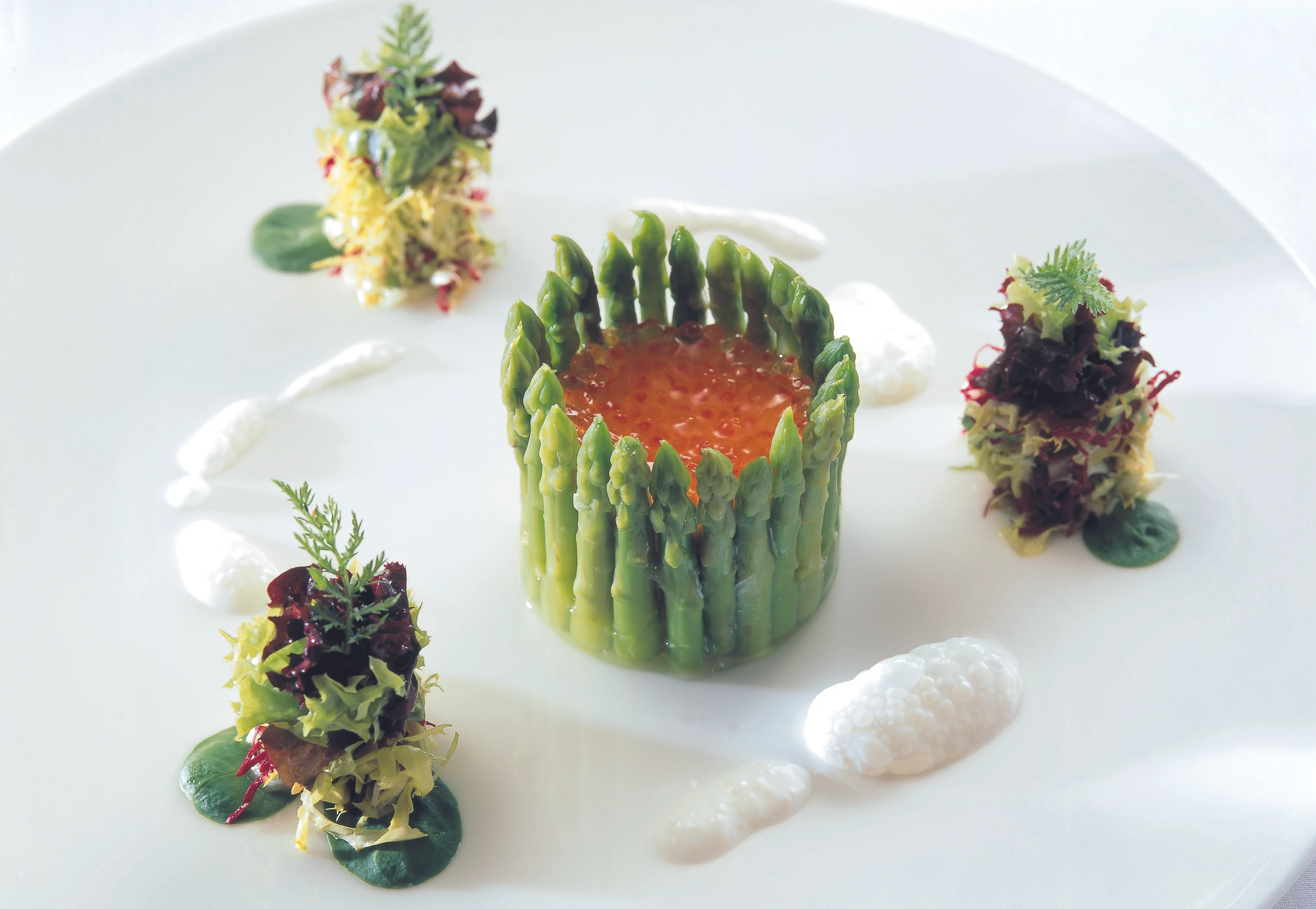 - Minispargel in leicht gesalzenem Wasser kurz kochen, in Eiswasser abschrecken und trockentupfen. 8 Ringformen (Ø ca. 6 cm) auf eine Platte stellen. Spargel auf ca. 8 cm Länge zuschneiden und in die Formen stellen. So viel Spargelmasse einfüllen, dass bis zu den Spargelspitzen noch ca. 1 cm frei bleibt. Förmchen vorsichtig mit Frischhaltefolie abdecken und die Törtchen mindestens 5 Stunden kühlen.