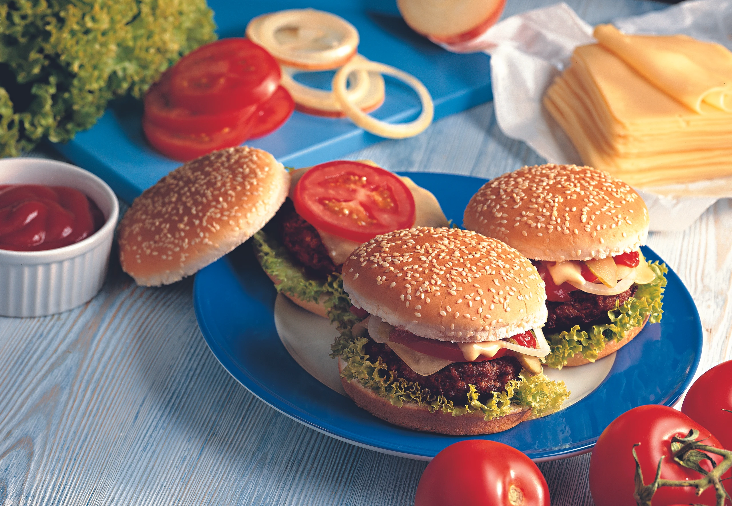 Laibchen durchschneiden, die Unterteile mit Salatblättern, je einem Burger, Paradeisern, Zwiebelringen und Gurkenstreifen belegen. Je 1 EL Senfmayonnaise und Ketchup darauf verteilen. Deckel daraufsetzen.