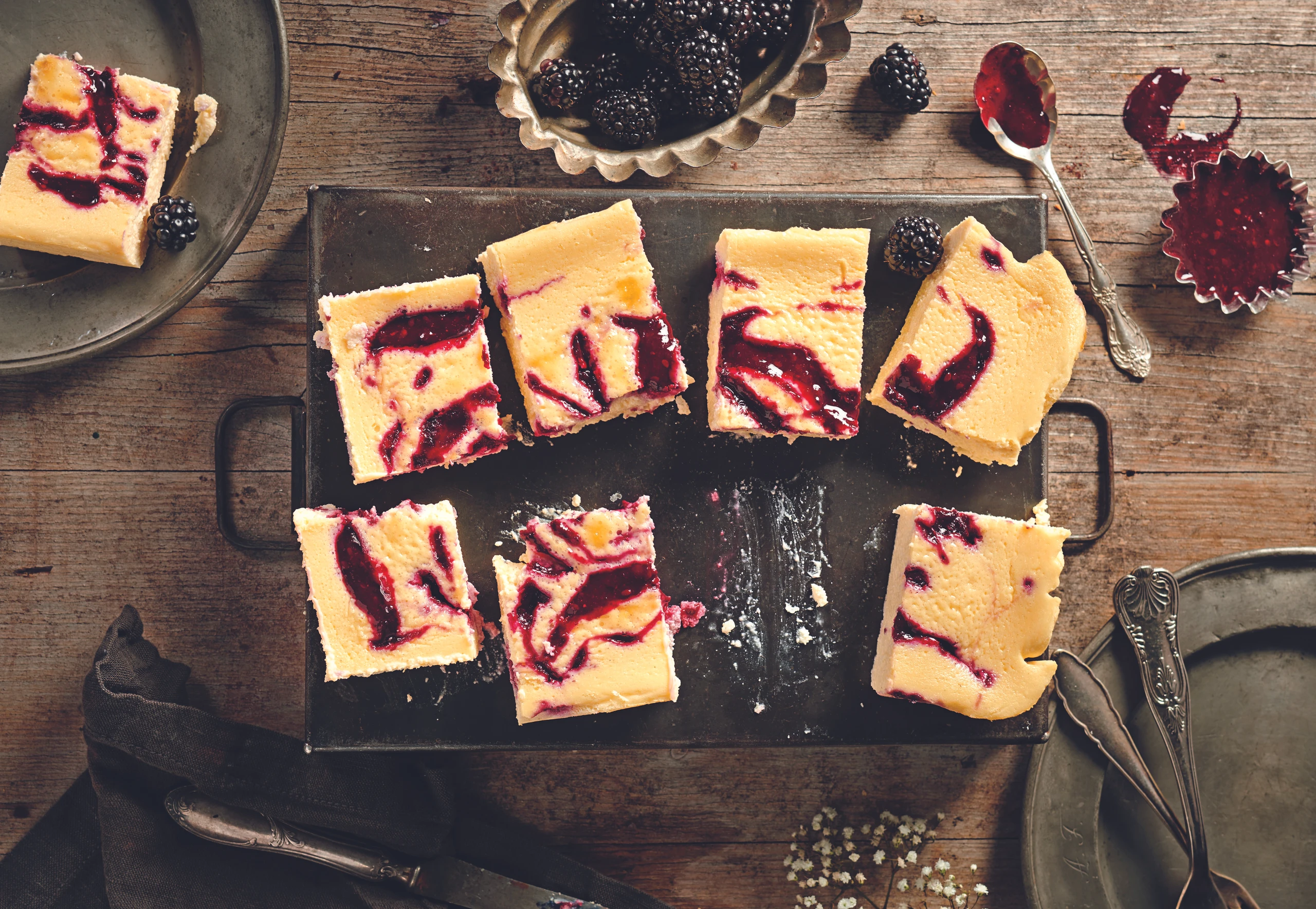 Rohr auf 160°C vorheizen. Auflaufform (25 x 20 cm) mit Backpapier auslegen. Frischkäse, Eier, Vanillepuder und übrigen Agavensirup verrühren. Masse in die Form leeren. Brombeerpüree darauf verteilen.