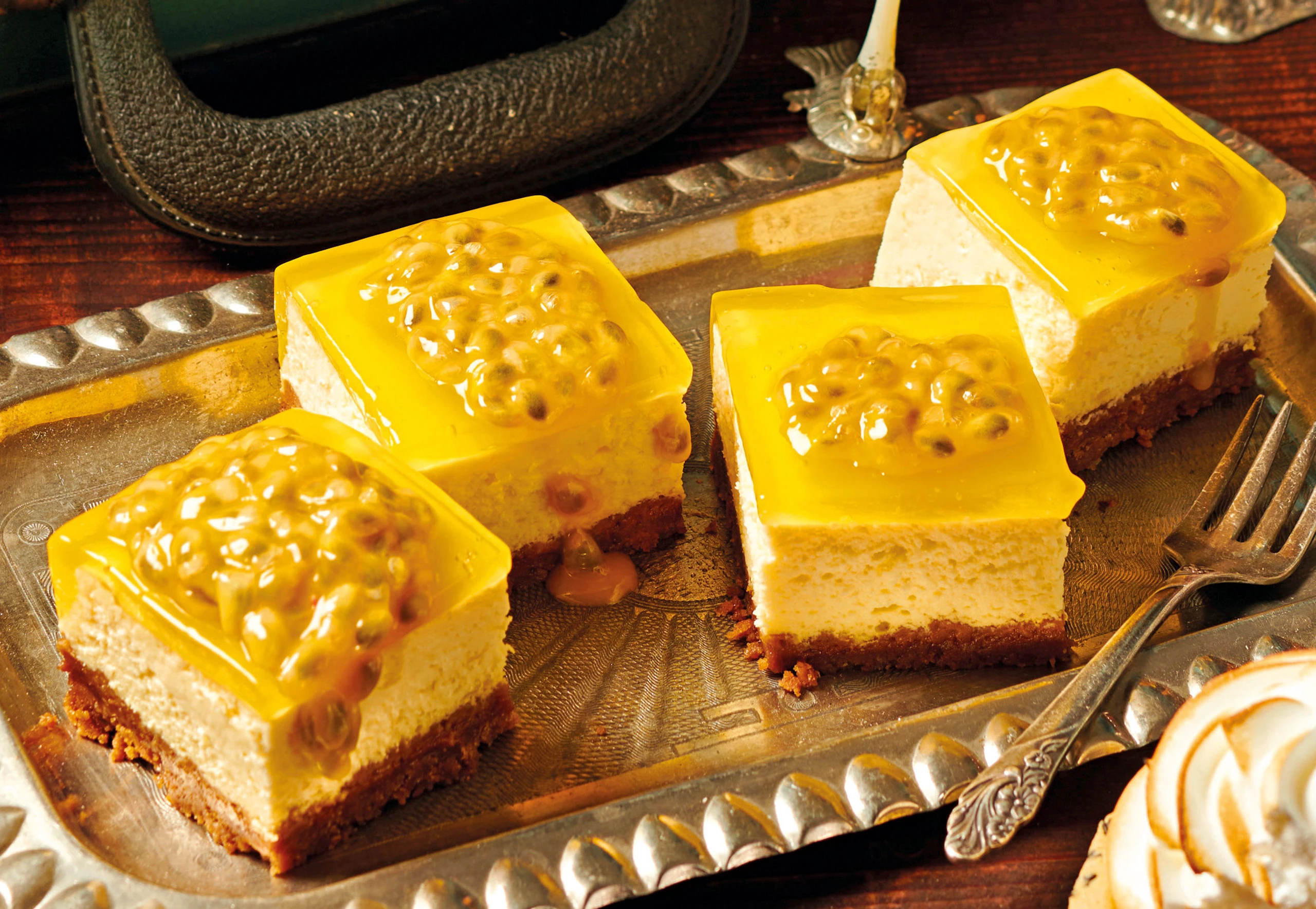 Cheesecake aus der Form lösen und in 25 Würfel schneiden. Fruchtfleisch aus den Maracujas lösen und auf den Würfeln verteilen.