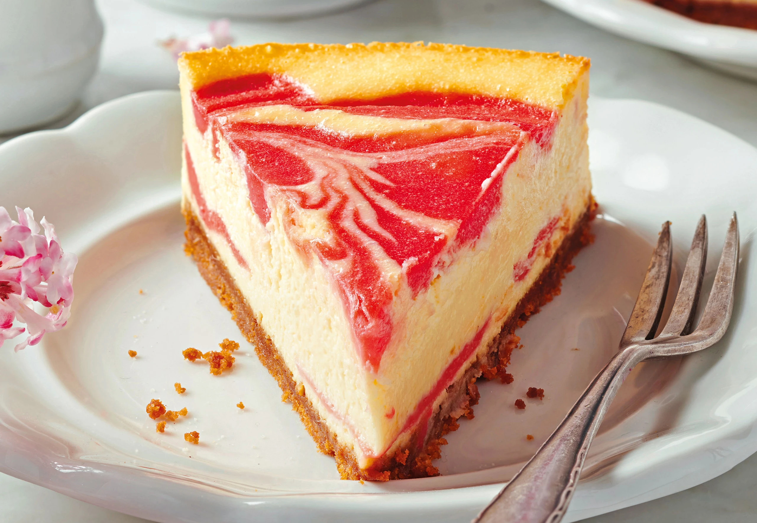 Rohr auf 170°C vorheizen. Für die Creme Frischkäse, Sauerrahm, Zuckersorten, Eier, Mehl und Zitronenschale verrühren. Die Hälfte davon auf dem Keksboden verstreichen. Die Hälfte vom Rhabarberpüree darauf verteilen. Übrige Frischkäsecreme einfüllen. Restliches Püree darauf verteilen und mit einer Messerspitze marmorieren.