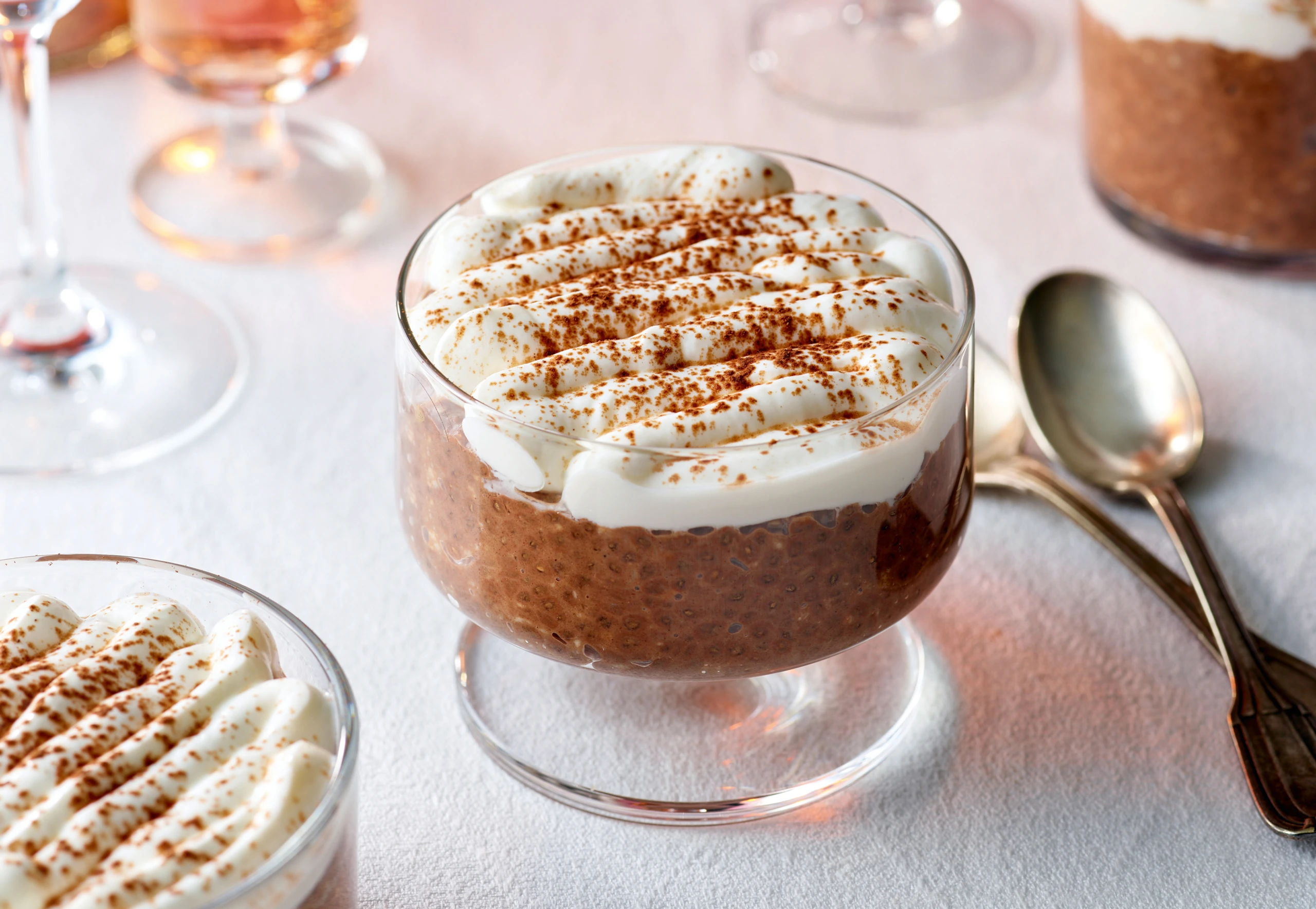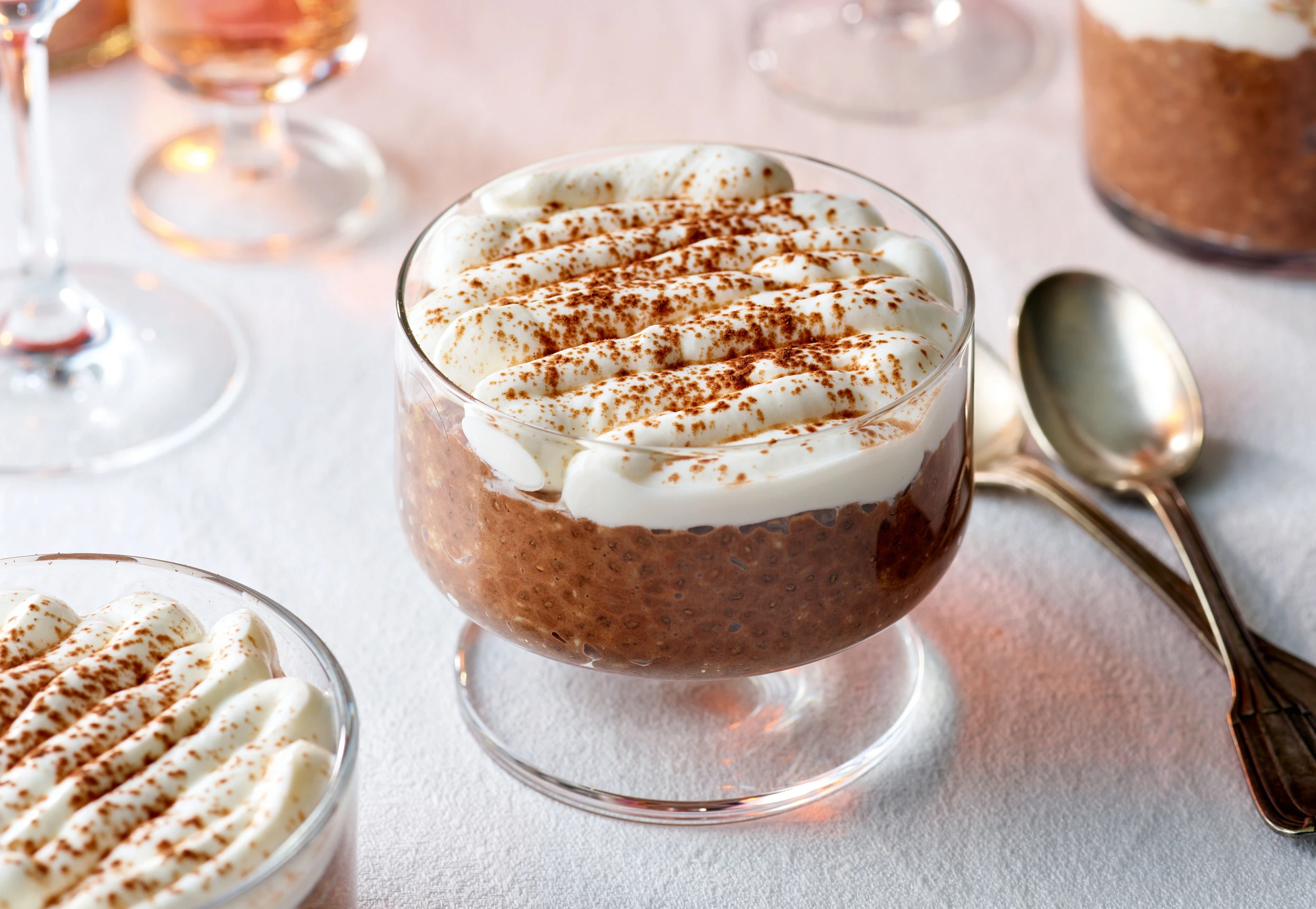 Pudding in Gläsern verteilen, Joghurt mit einem Dressiersack aufdressieren und mit Kakaopulver bestreuen.