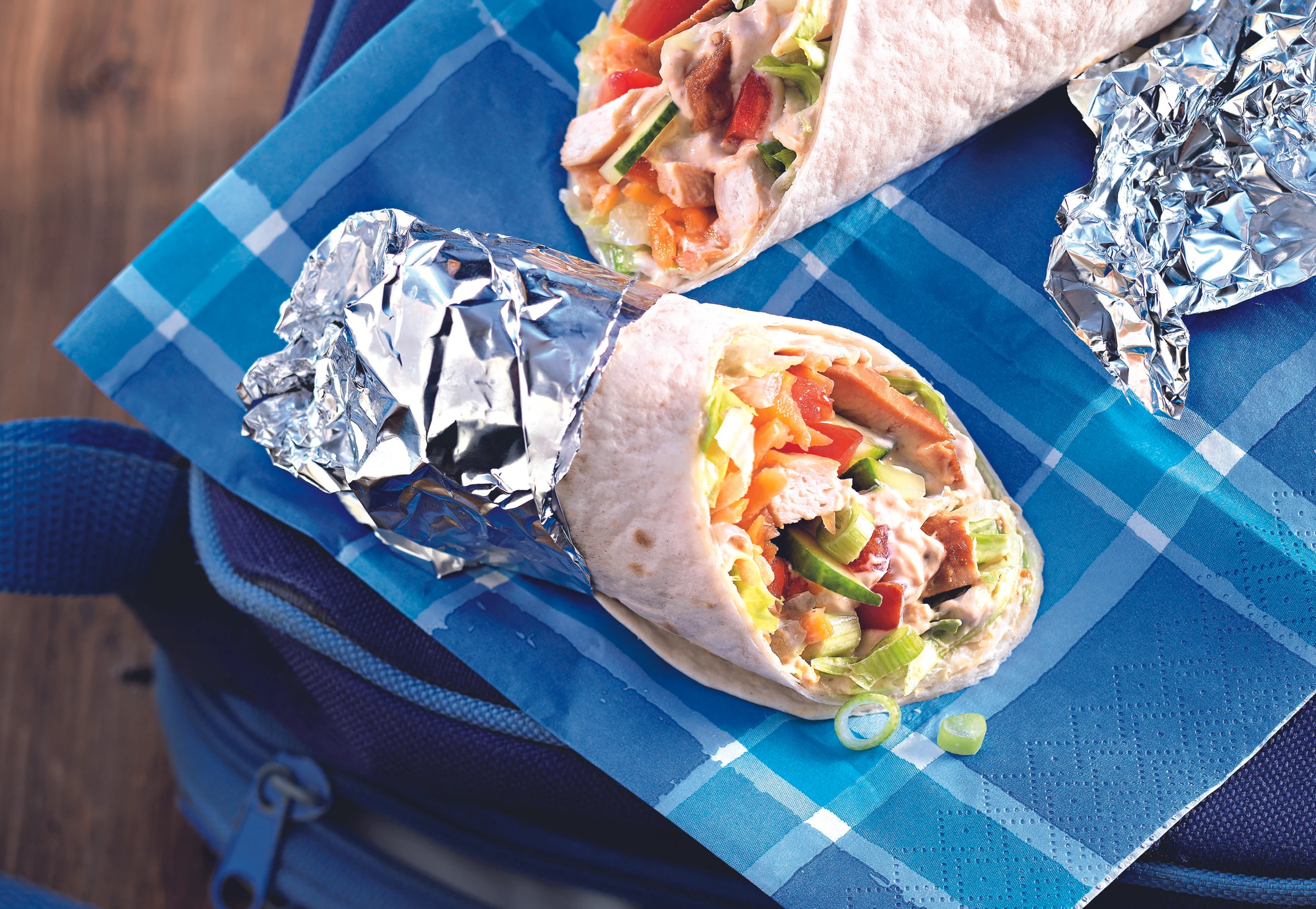 Wrap-Tortillas jeweils mit 1 EL Erdnuss-Dip bestreichen und in der Mitte mit Salat, Hühnerfleisch, Paradeisern, Gurken, Karotte und Jungzwiebeln belegen. 1 EL Erdnuss-Dip daraufgeben. Wraps seitlich etwas einschlagen und einrollen. Die Enden der Wraps fest in Alufolie wickeln. Wraps in der Mitte durchschneiden. Restlichen Dip dazu reichen.