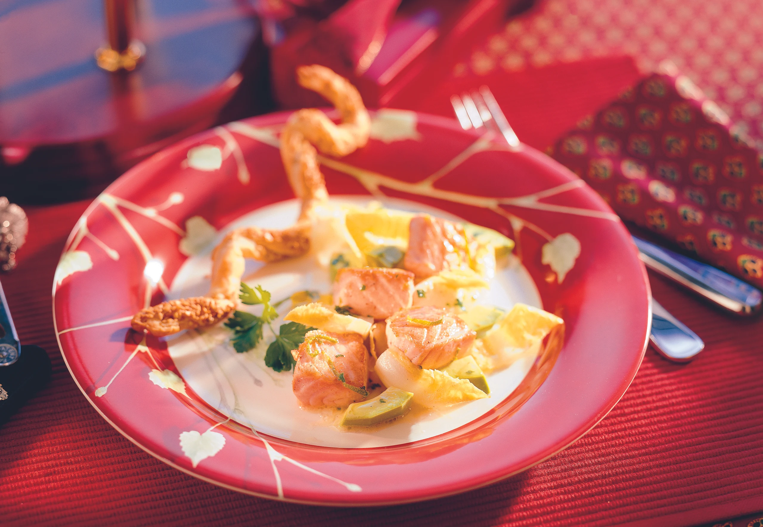 Chicorée-Avocadosalat mit Lachs und Sesamstangerln