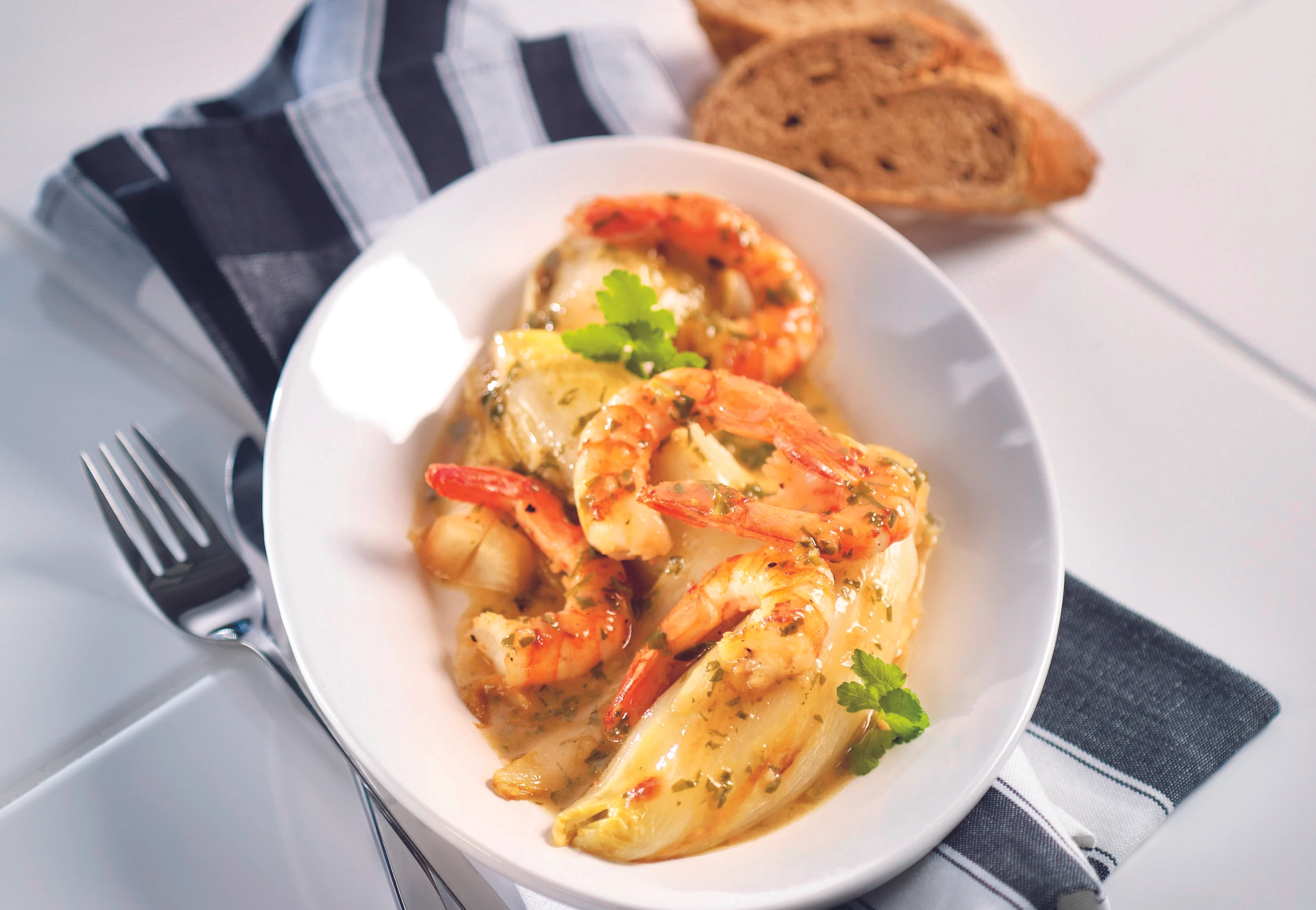 Parallel dazu Garnelen in Öl beidseitig anbraten, mit Salz und Pfeffer würzen. Chicorée mit den Garnelen anrichten und mit der Sauce übergießen. Dazu passt Baguette.