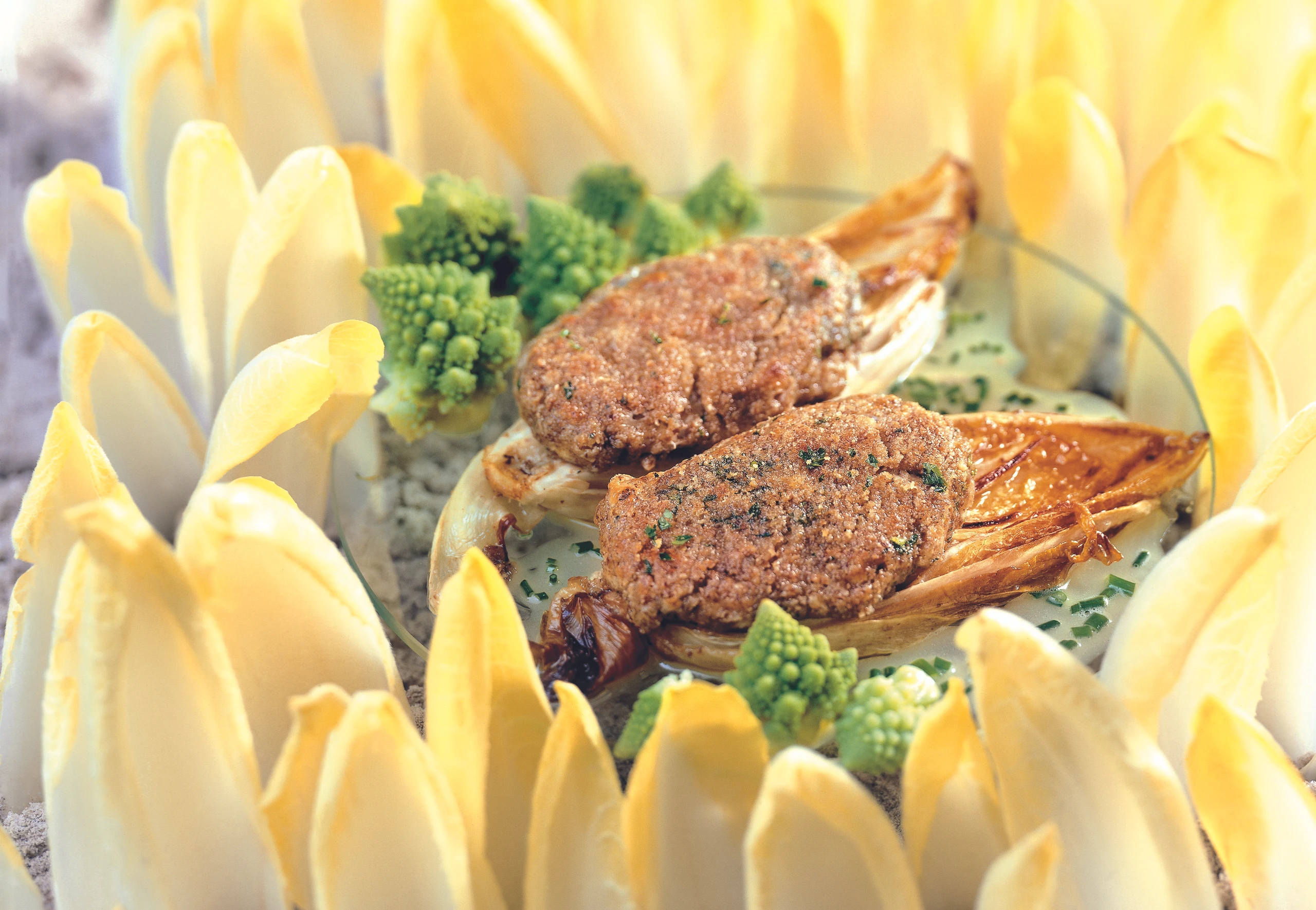 Für die Sauce Wein mit Suppe aufkochen. Stärke mit 1 EL kaltem Wasser verrühren und in die Sauce gießen. Sauce aufkochen, vom Herd nehmen und durch Einrühren der Butterstücke binden – die Sauce darf nicht mehr kochen -Chicorée mit Käse-Nusskruste Kräuter untermischen. Chicorée mit der Sauce und den Beilagen anrichten.