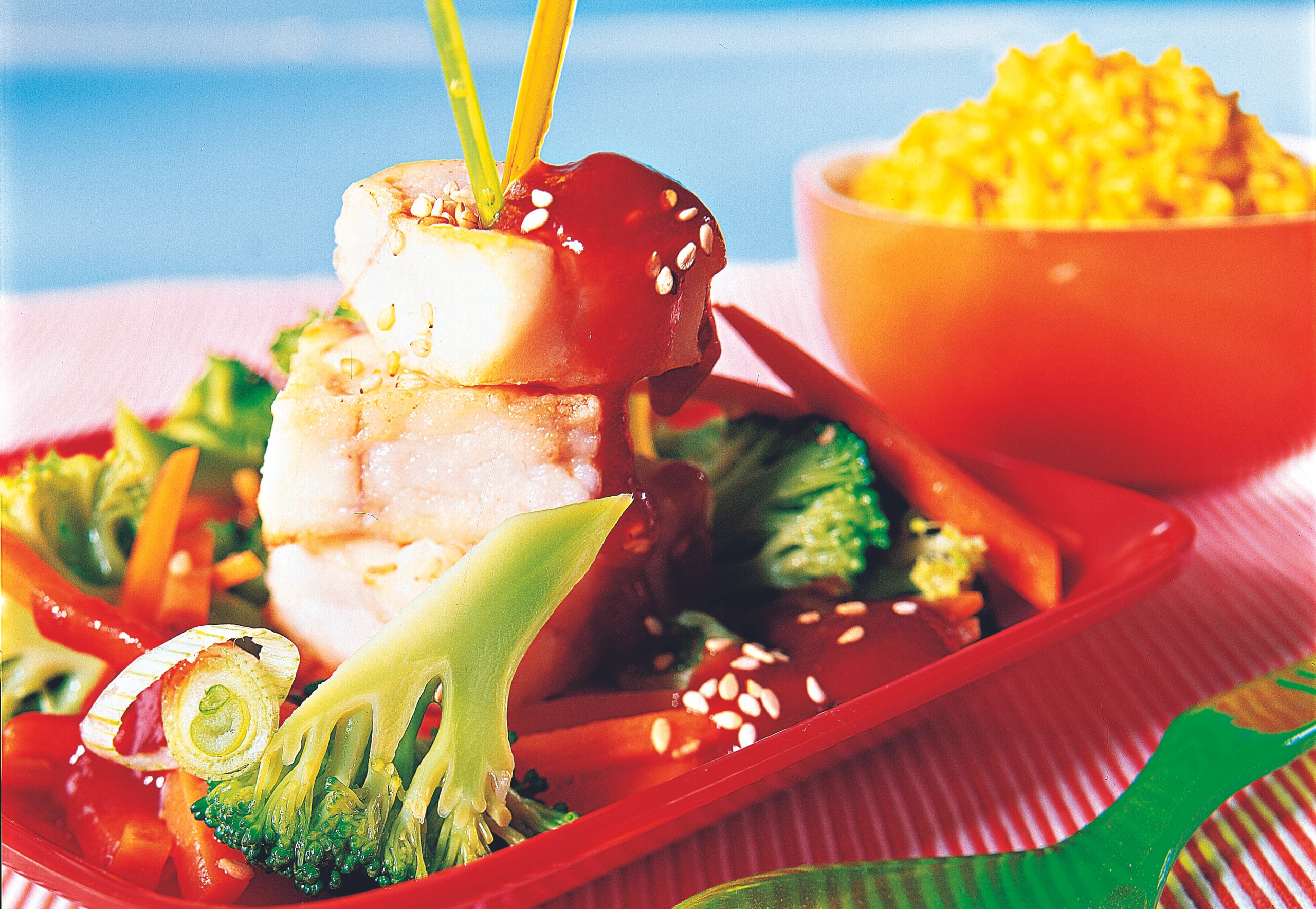 Fisch auf Spießchen stecken, auf dem Gemüse anrichten und mit Sesam bestreuen.