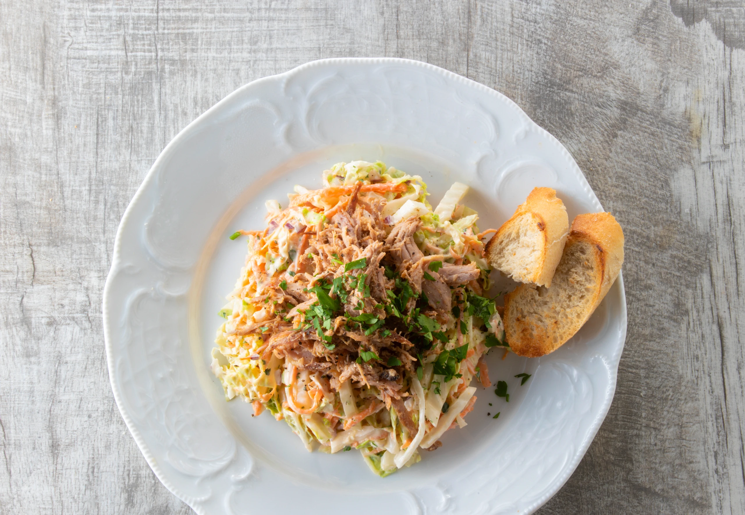 Salat mit Pulled Pork anrichten, mit übriger Petersilie bestreuen und mit Baguette servieren.