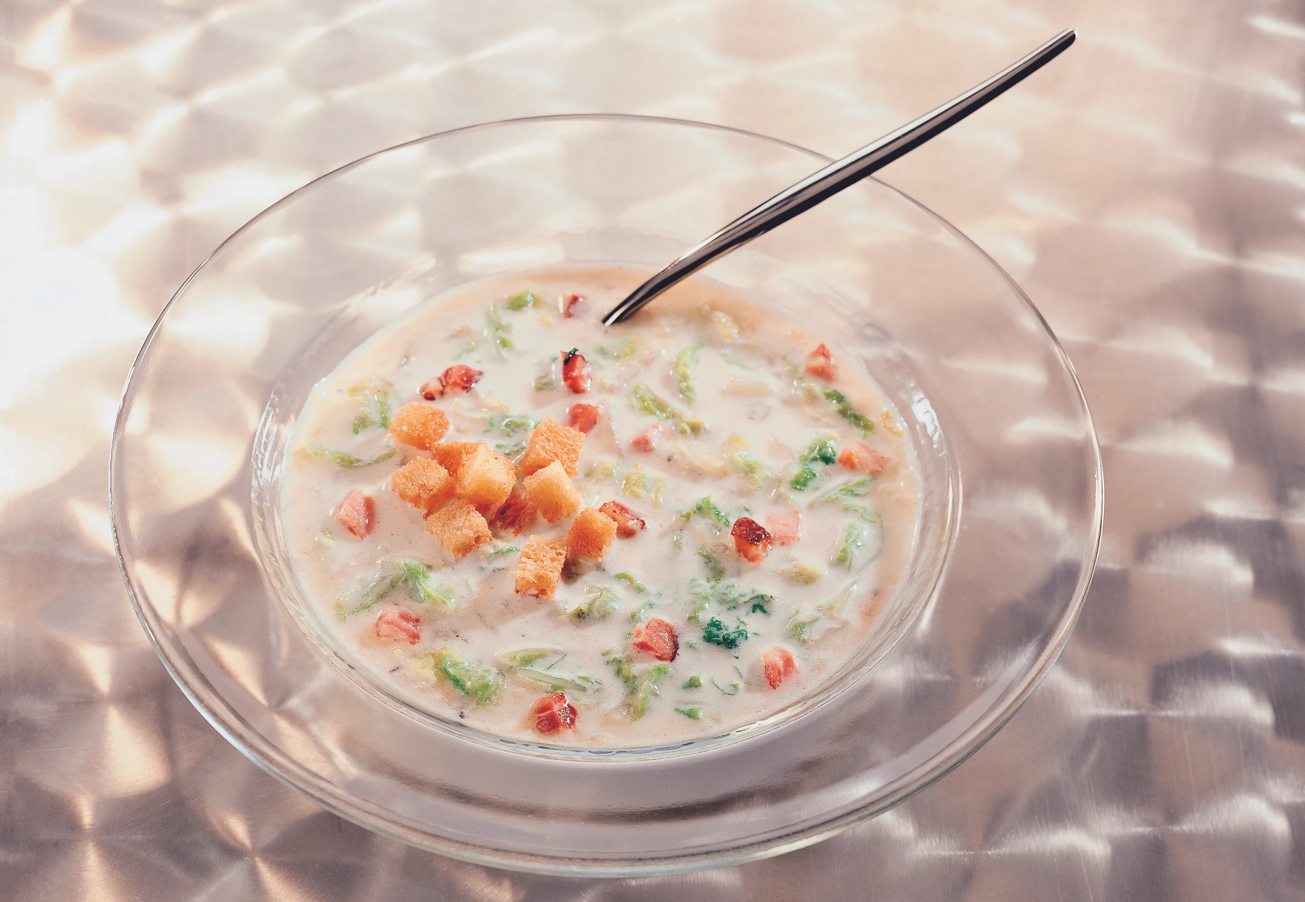 Suppe mit einem Stabmixer pürieren, mit Salz, Pfeffer, Kümmel und Zitronensaft würzen. Reservierten Chinakohl untermischen, Suppe noch 3 Minuten köcheln. Für die Variante gut gekühltes QimiQ einrühren. Suppe in Teller schöpfen, mit Speck- und Brotwürfeln sowie mit Schnittlauch bestreut servieren.