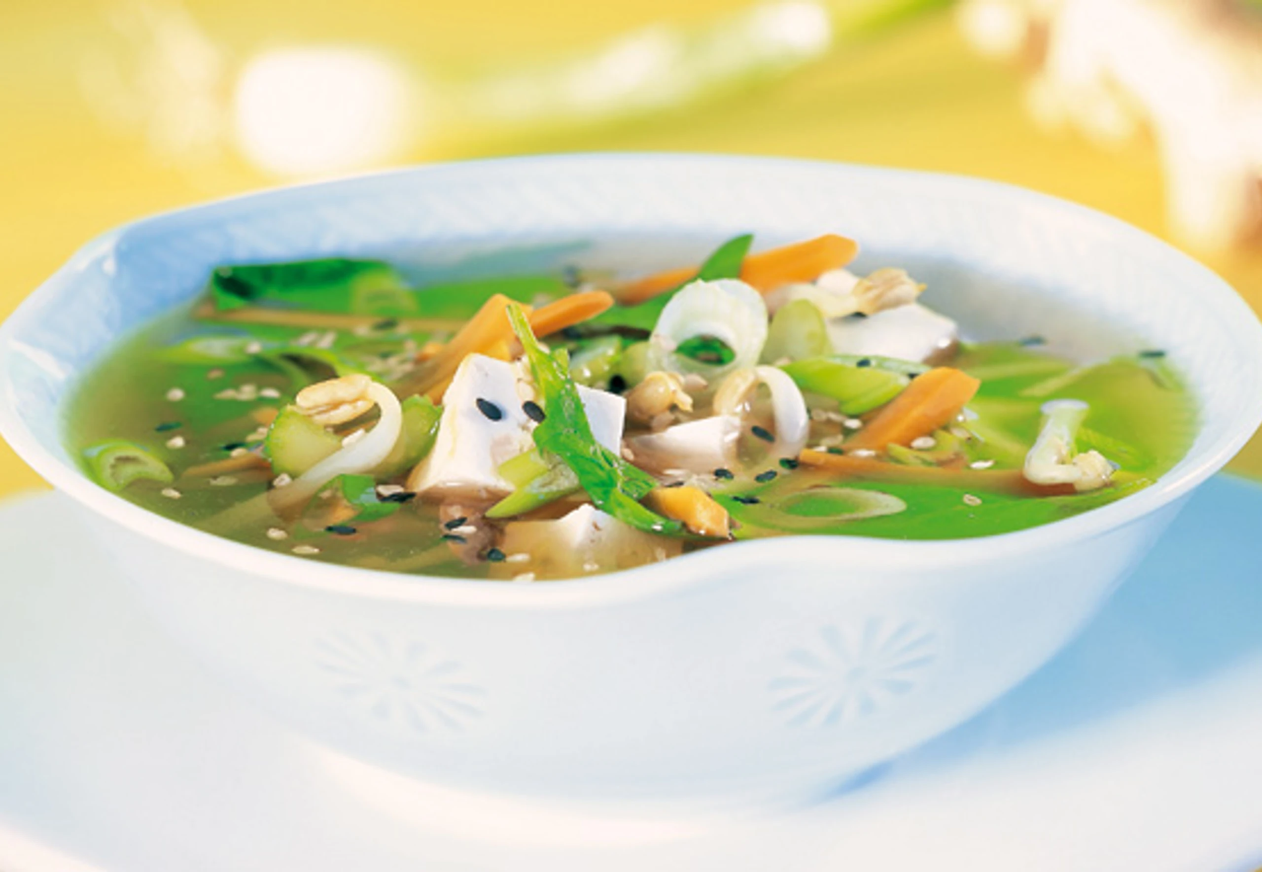 Chinesische Gemüsesuppe mit Sprossen und Tofu