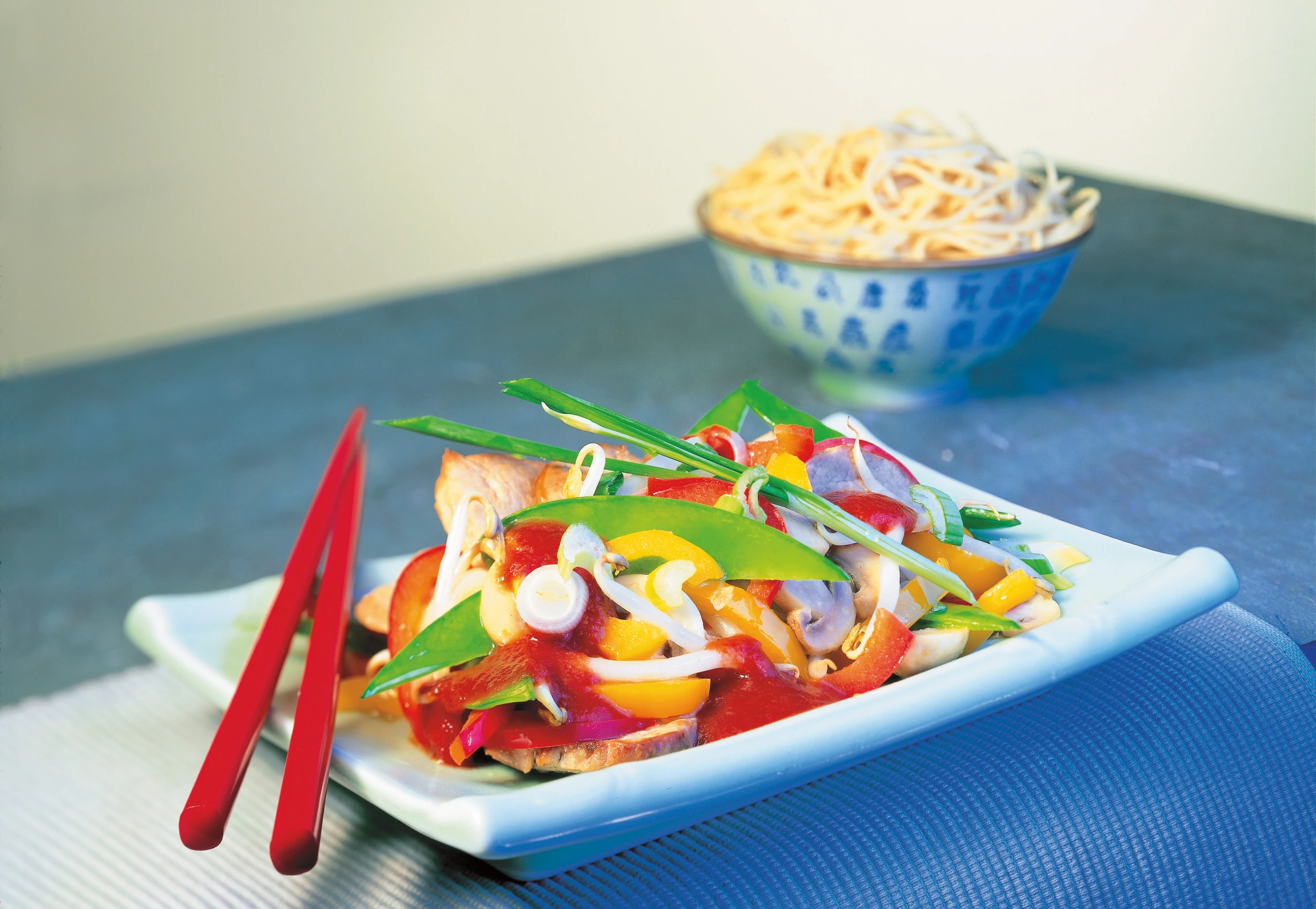 Sojasauce, Sherry, passierte Paradeiser, Ingwer, Speisestärke, 1 Prise Chili und 2 EL kaltes Wasser zu einer glatten Sauce verrühren.