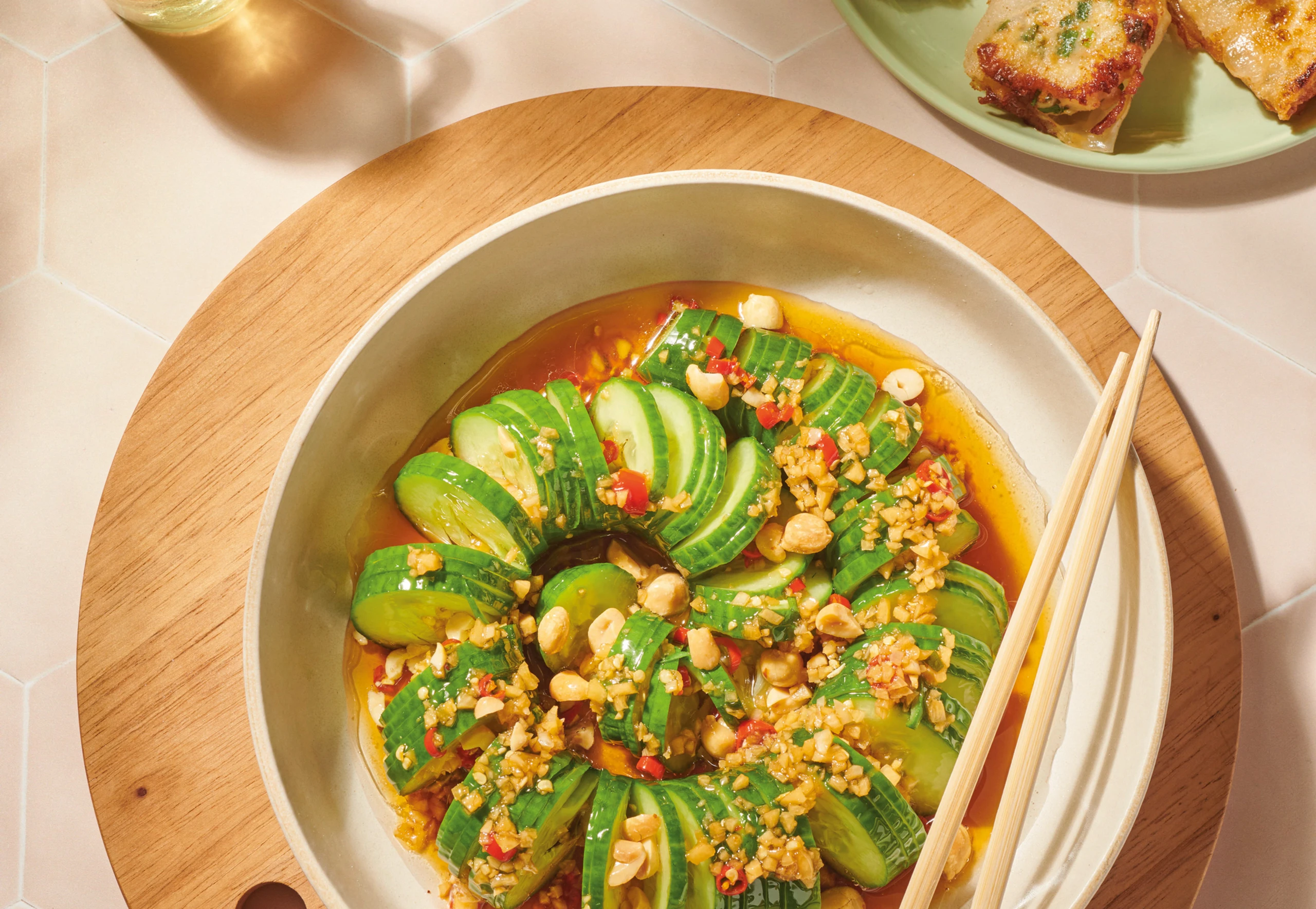 Chinesischer Gurkensalat mit crunchy Garnelentascherln