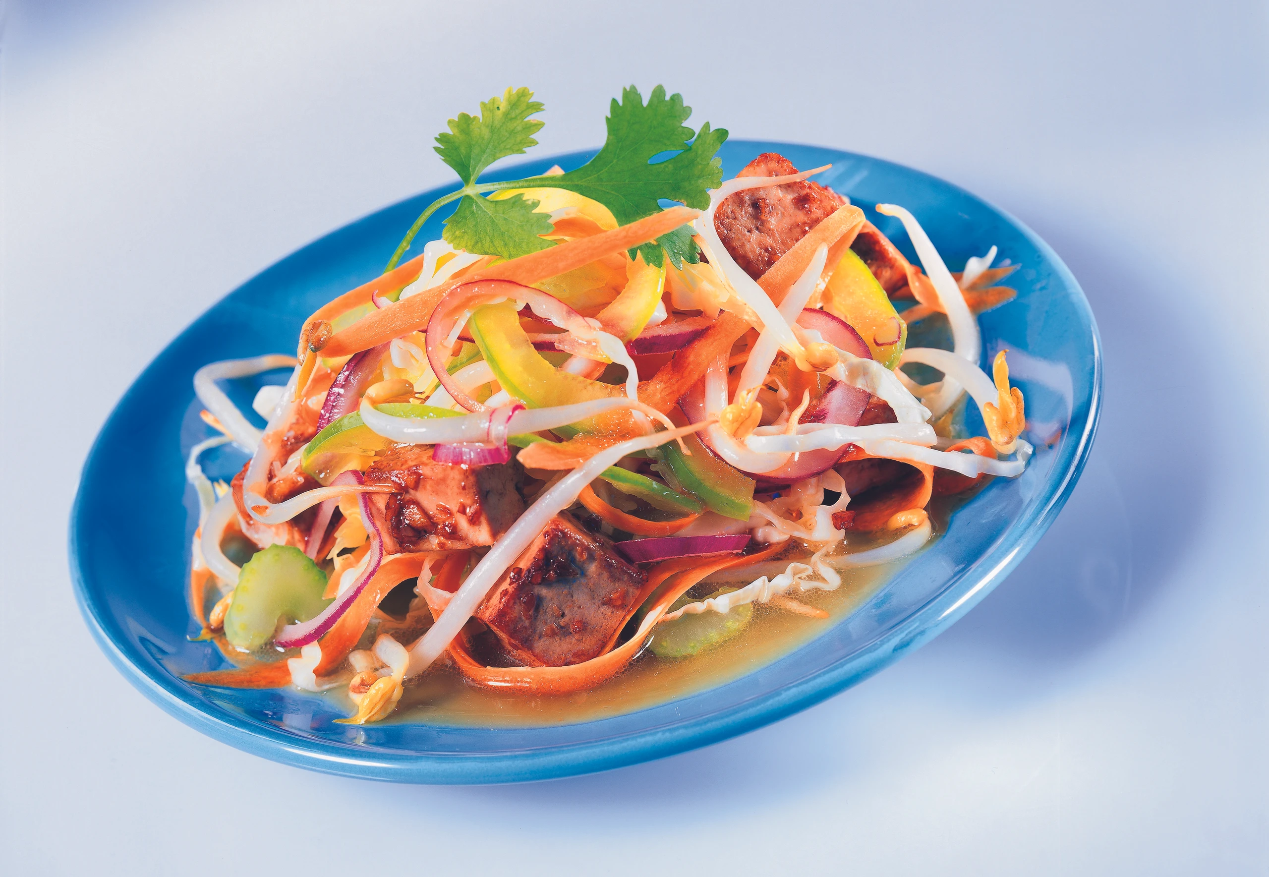 Kraut, Zwiebel, Knoblauch, Karotte, Paprika, Sellerie, Tofu und Sprossen mit dem Dressing vermischen. Salat mit Salz und Chili abschmecken, mit Koriander oder Petersil dekoriert servieren.