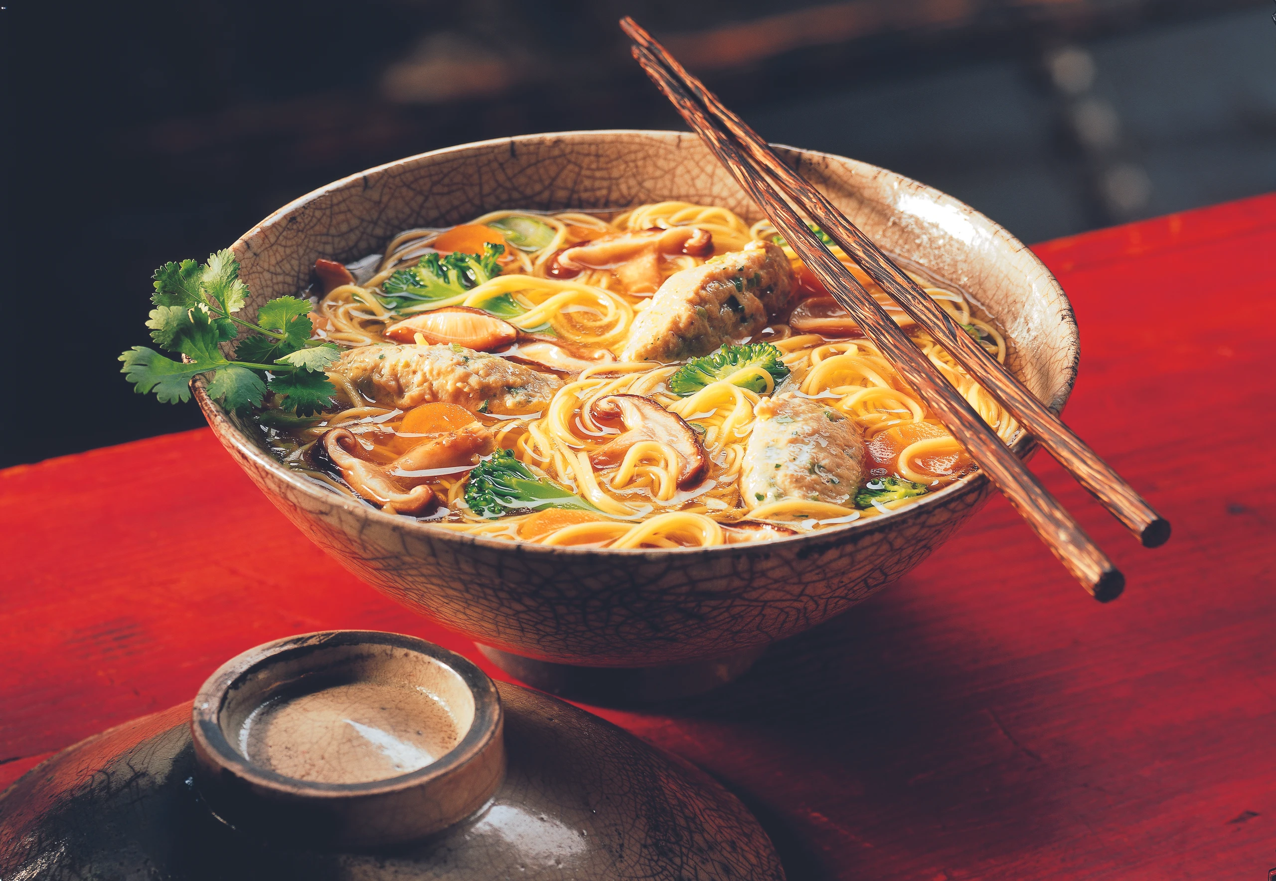 Nudeln in großen Suppenschüsseln verteilen. Nockerl, Gemüse und Pilze darauf geben, mit Hühnersuppe auffüllen, mit Jungzwiebeln und Koriander garnieren.