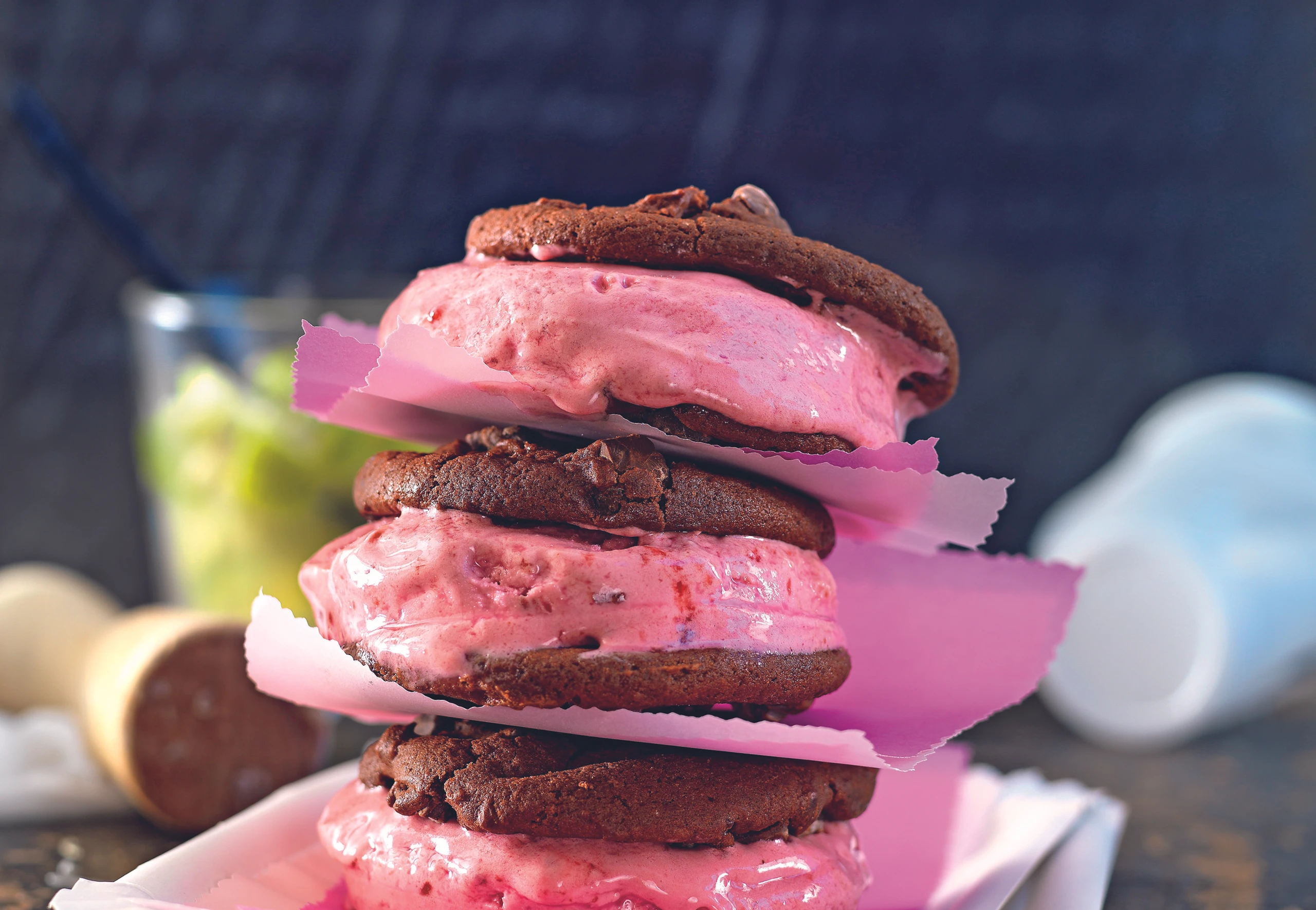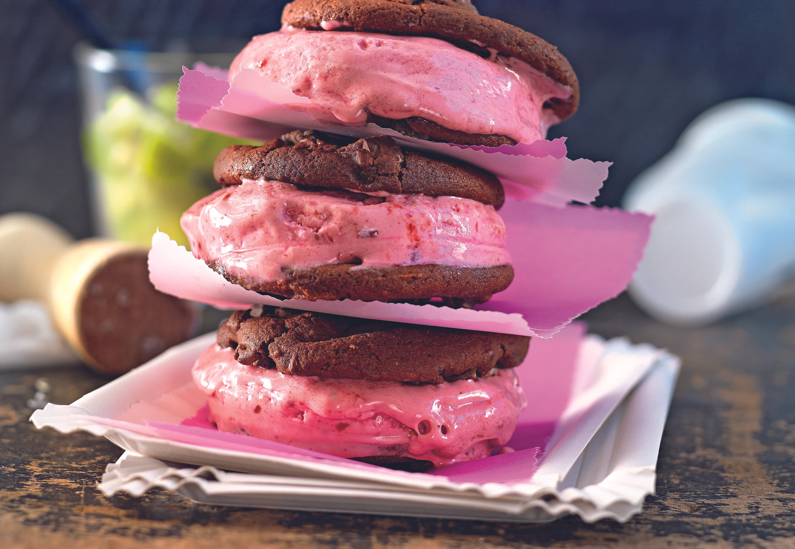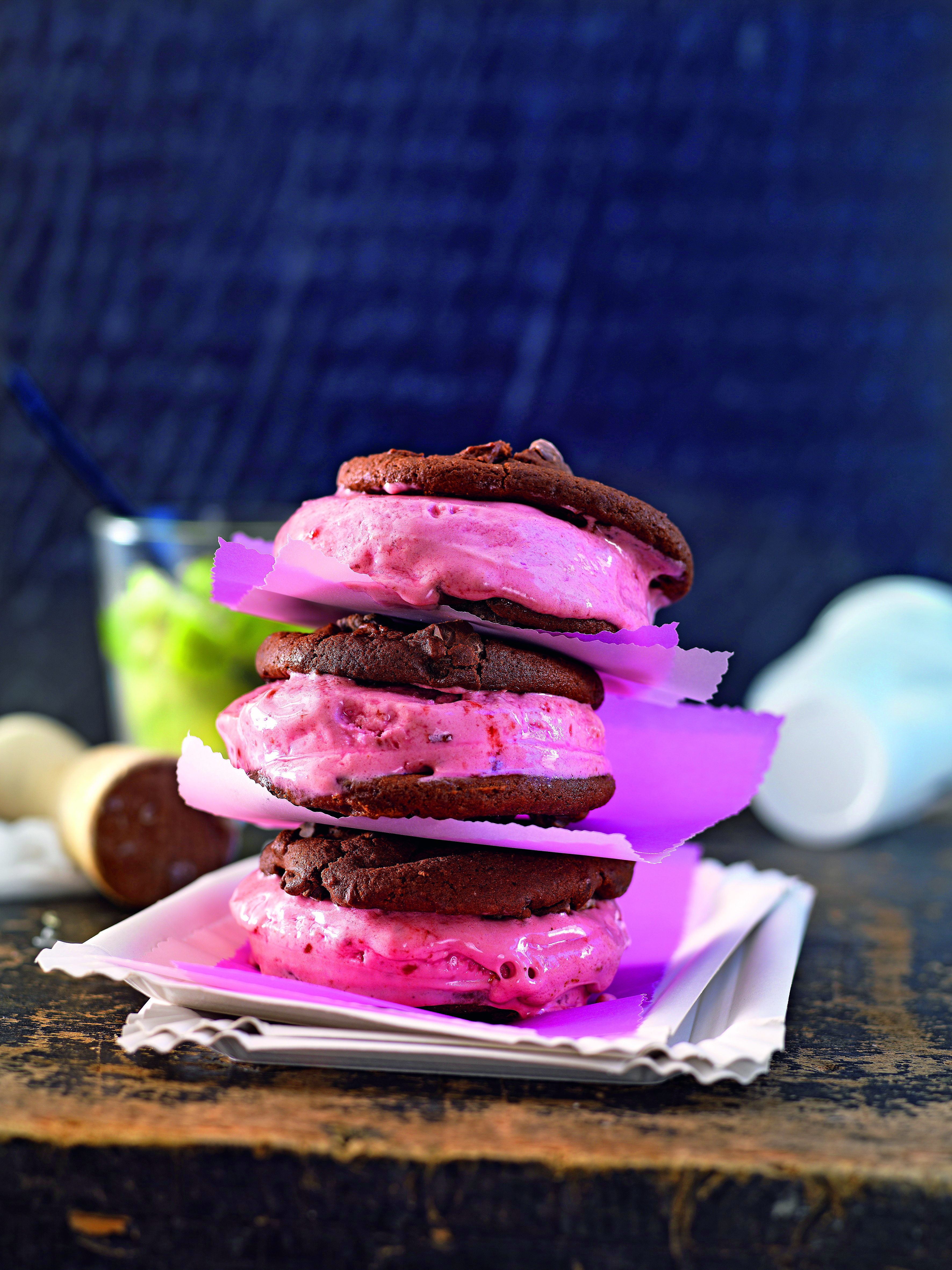 - Die Hälfte der Kekse mit der flachen Seite nach oben auflegen und mit je 1 Manschette aus Alufolie (ca. 2 cm hoch) umwickeln. Eis einfüllen. Mit je 1 Keks abdecken. Burger für ca. 1 Stunde tiefkühlen.