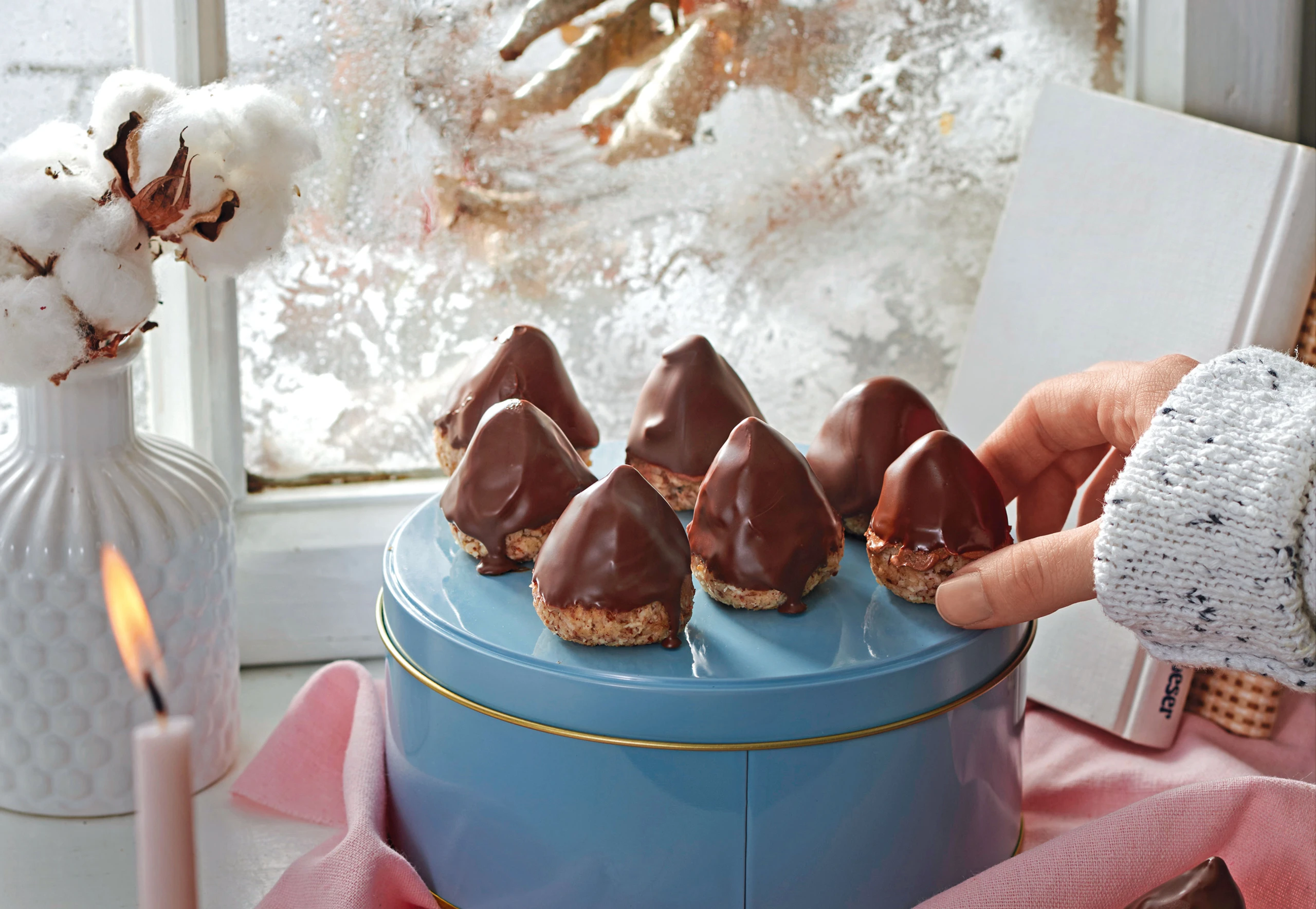 Chokladbollar in die Glasur tunken und auf Backpapier trocknen lassen.