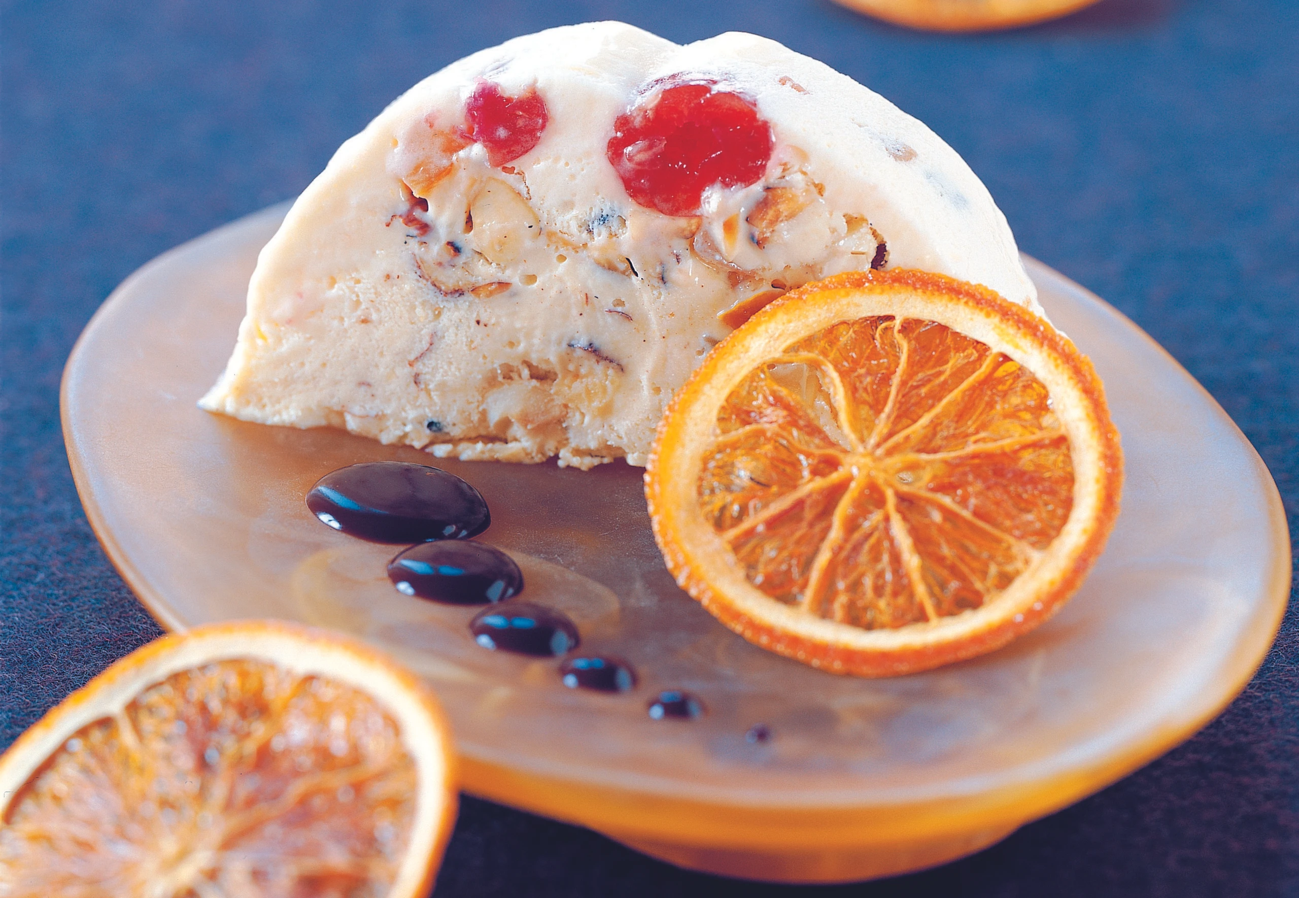 Parfait aus dem Tiefkühler nehmen und portionieren. Mit der Sauce anrichten und mit Orangenscheiben garnieren.