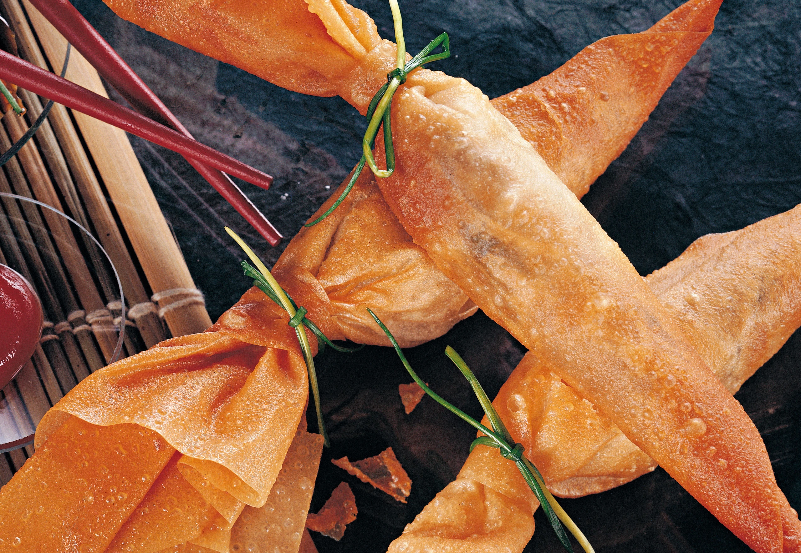 Backfett auf kleiner Flamme mittelheiß (ca. 120 °C) erhitzen, Teigrollen hineinlegen und Hitze langsam erhöhen, bis das Backfett ca. 170 °C heiß ist und die Teigrollen goldbraun sind. (Nur so wird der Teig knusprig und bleibt trocken) Teigrollen mit einem Siebschöpfer herausheben, auf Küchenkrepp gut abtropfen lassen und mit pikanter Sauce oder mit Ketchup servieren.