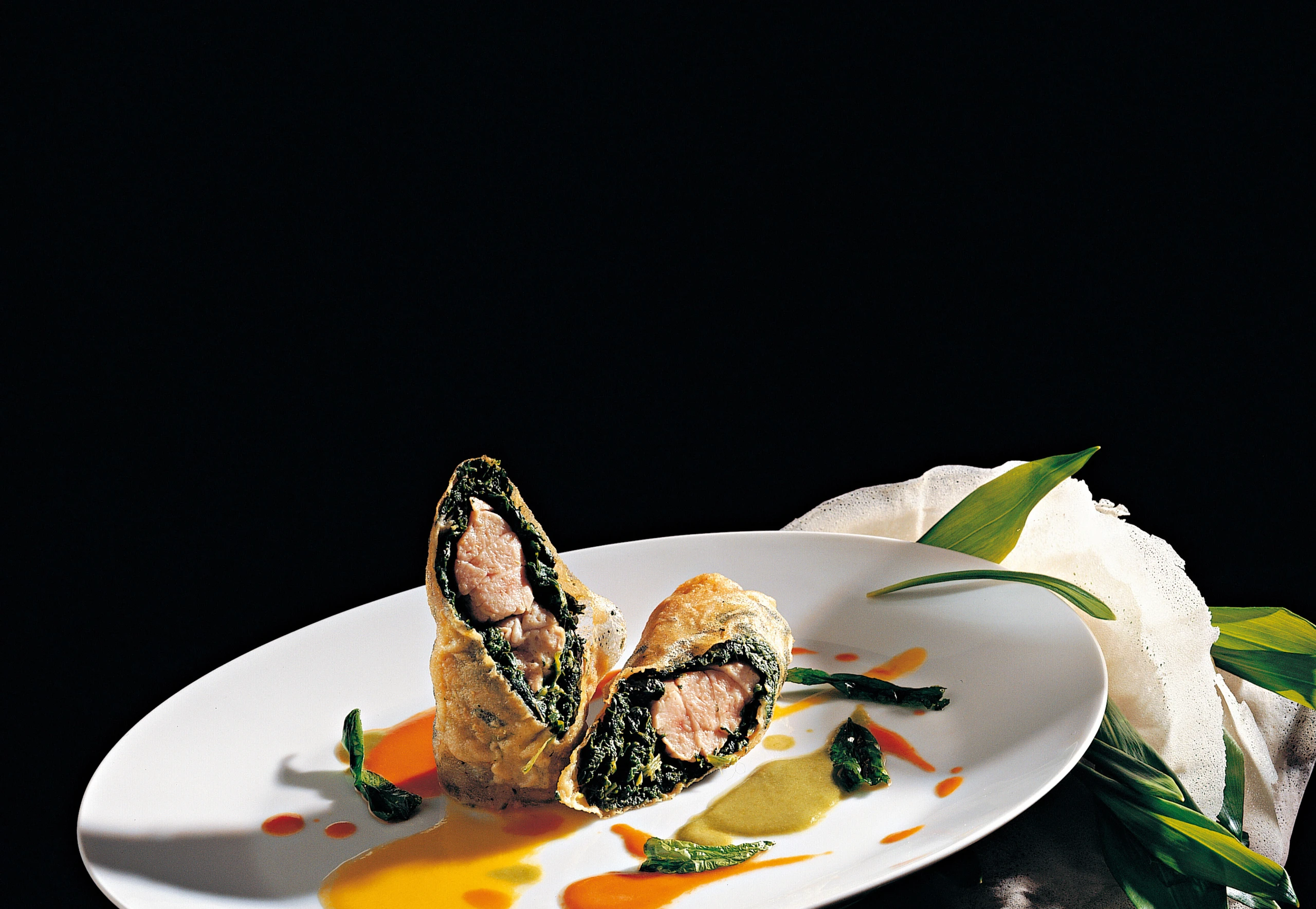 Teigdreiecke mit Fülle belegen und einrollen. Strudelröllchen mit den Teigstreifen „zubinden“. Restlichen Teig und übrige Fülle genauso verarbeiten. Besonders hübsch sehen die Teigrollen aus, wenn man sie zusätzlich mit Schnittlauchschleifen garniert.