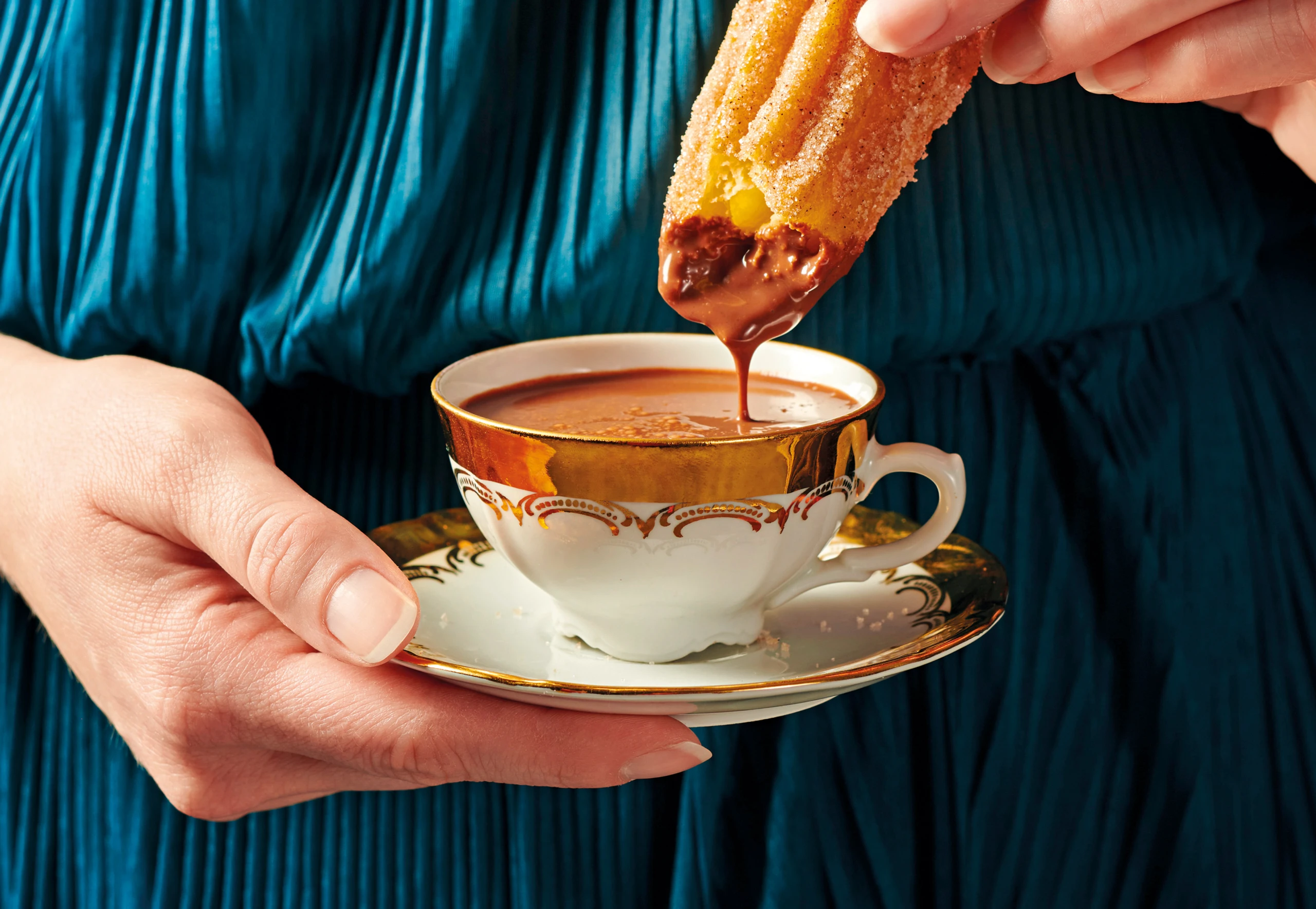 Churros goldbraun backen, herausnehmen, abtropfen lassen und noch heiß im Zimtzucker wälzen. Mit der heißen Schokolade servieren.