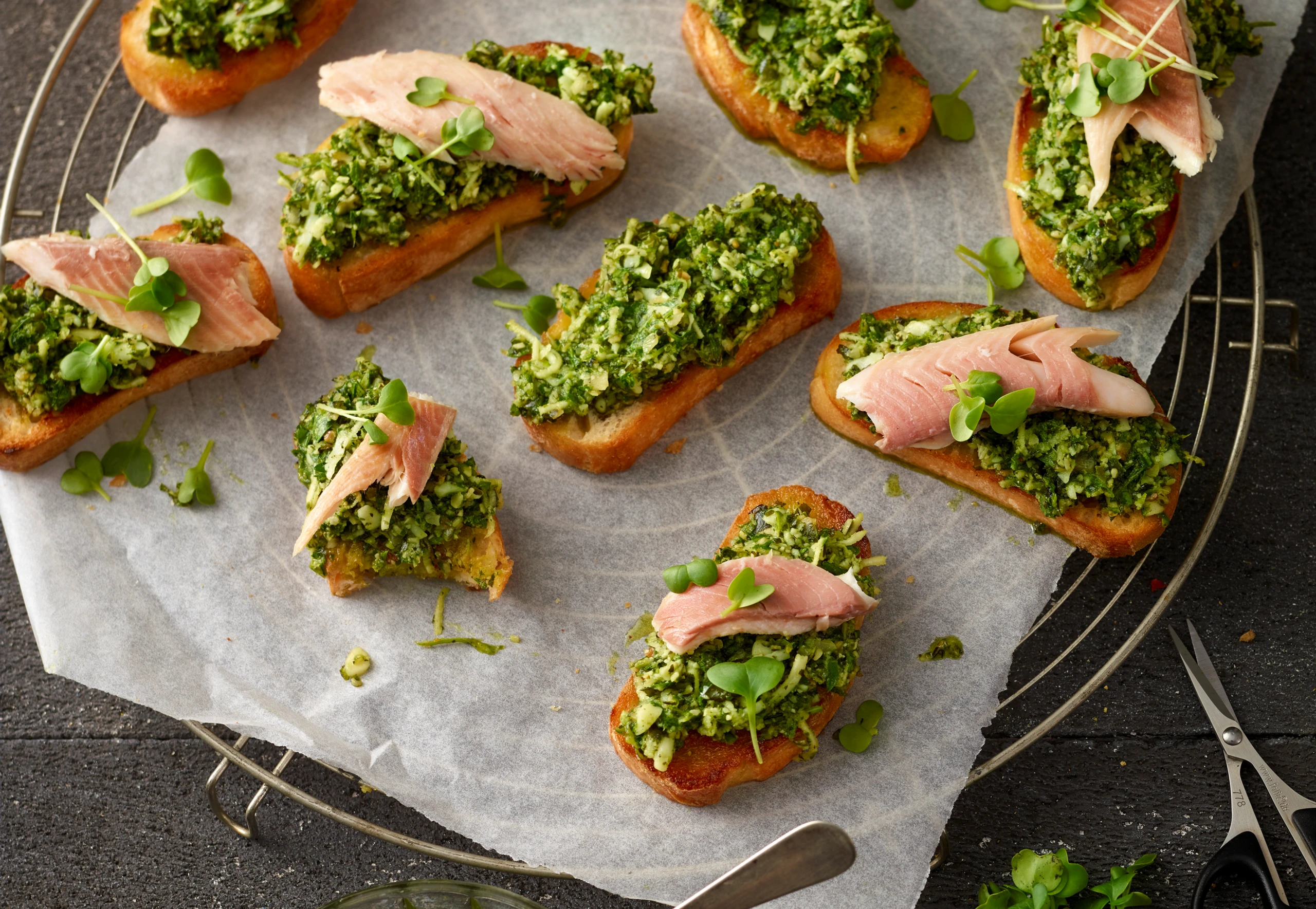 Ciabatta mit Kürbiskernpesto und Räucherforelle