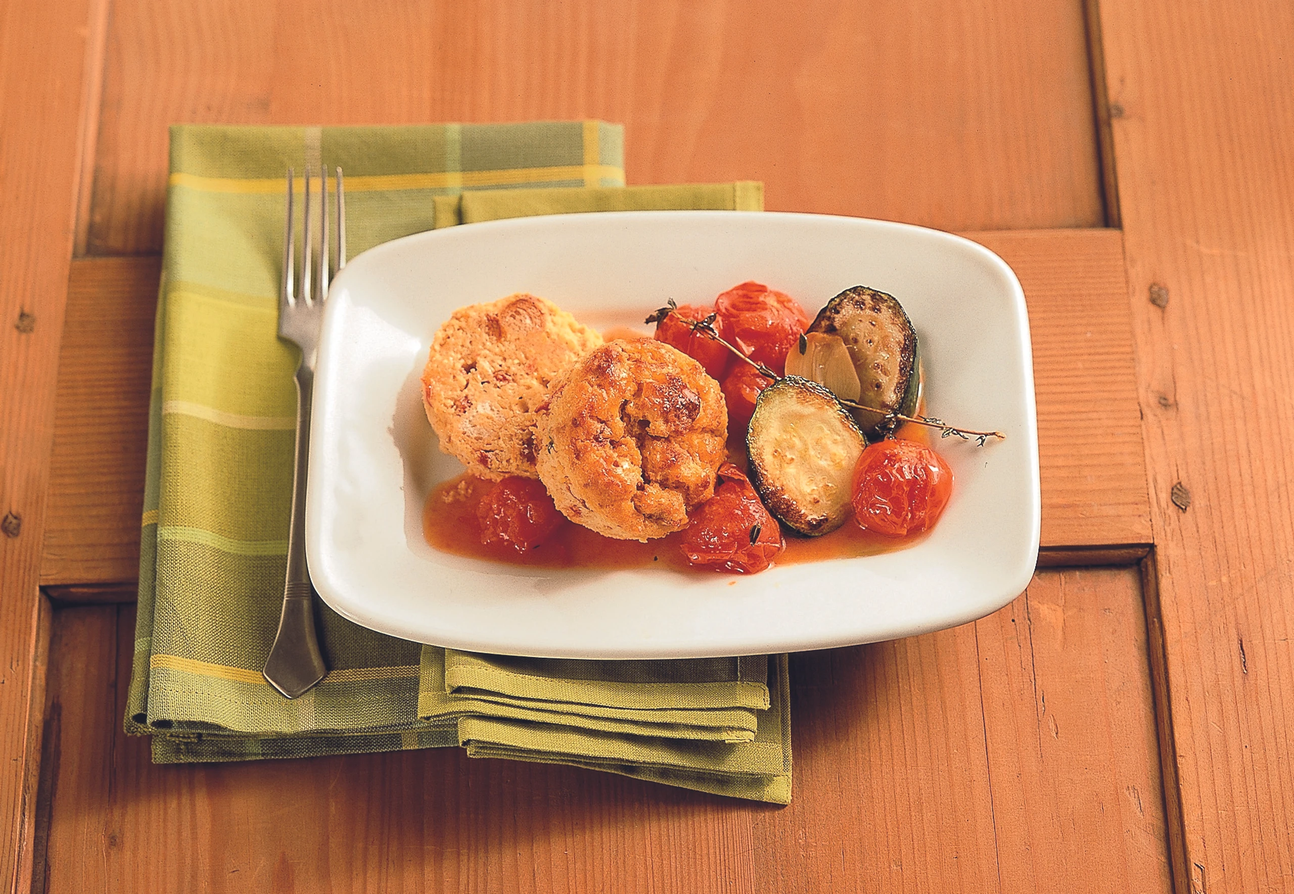 Ciabatta-Polenta-Auflauf mit Paradeiser-Zucchini-Gemüse