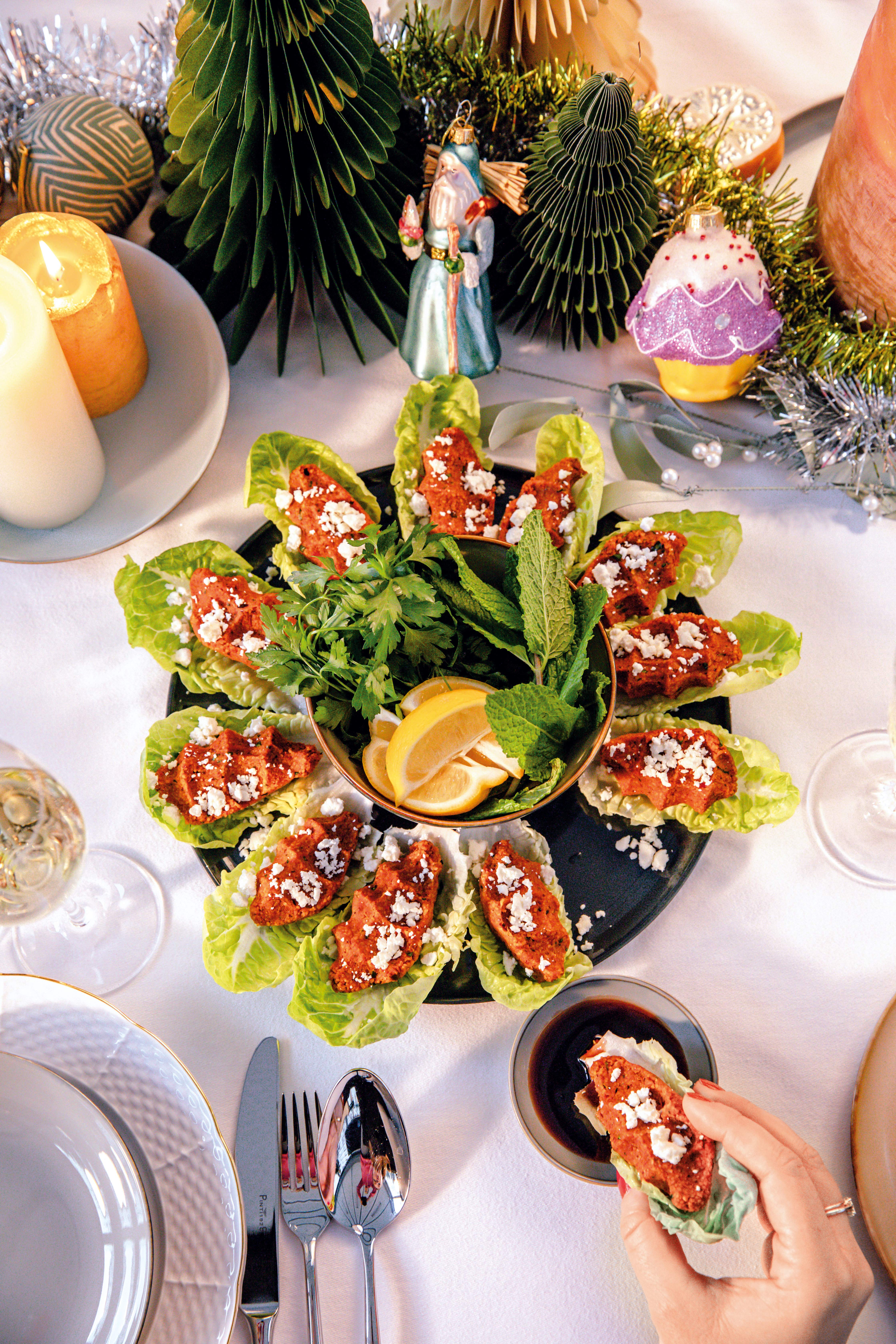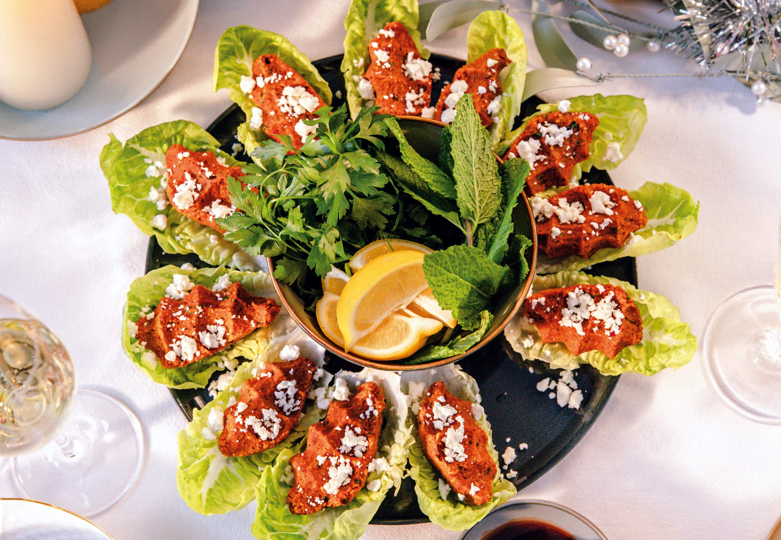 Mit Salat, Kräutern, Zitronenspalten, (falls verwendet) Feta und Granatapfelsirup servieren.