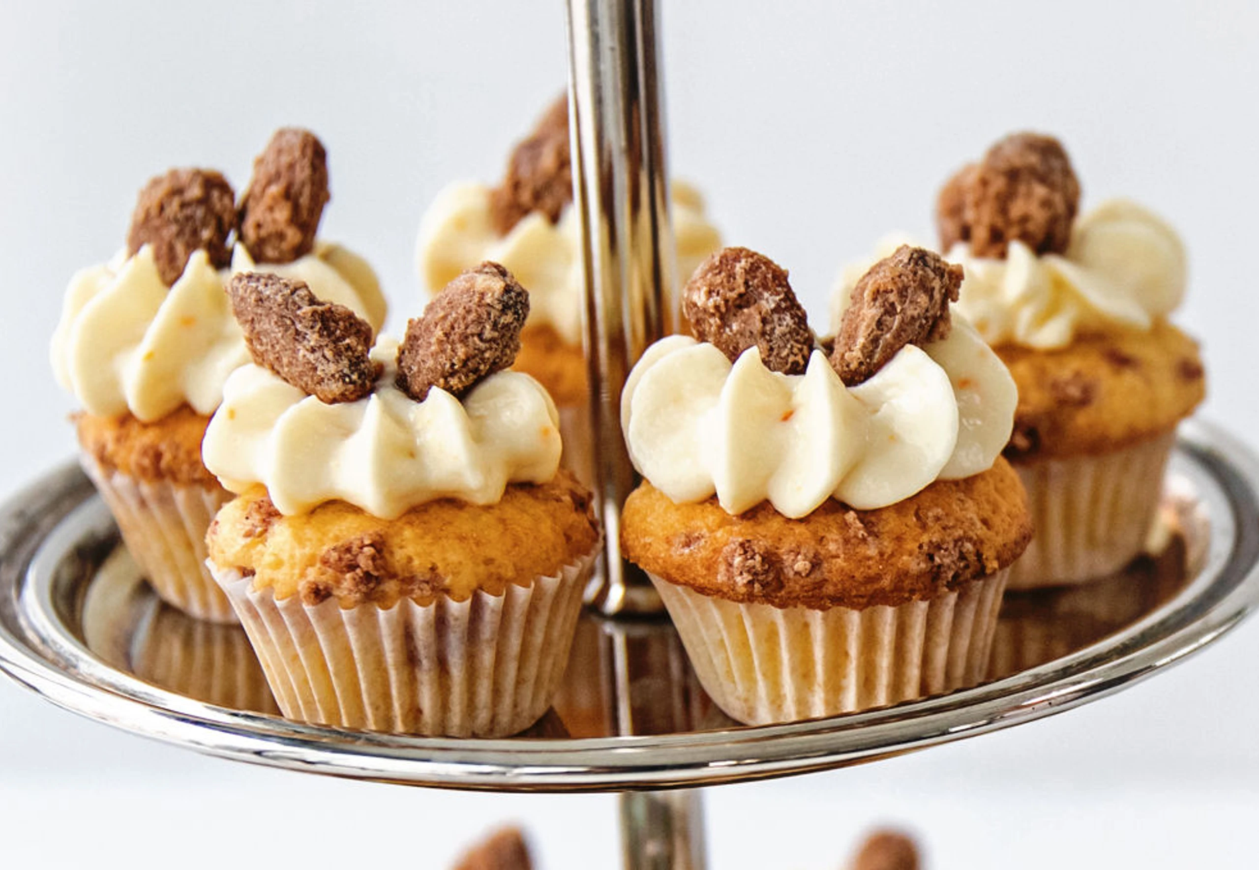 Für die Creme Butter und Zucker aufmixen. Frischkäse, Clementinenschale und -saft unterrühren. Creme in einen Dressiersack mit Sterntülle füllen und Tupfen auf die Cupcakes dressieren. Mit den übrigen Mandeln verzieren.