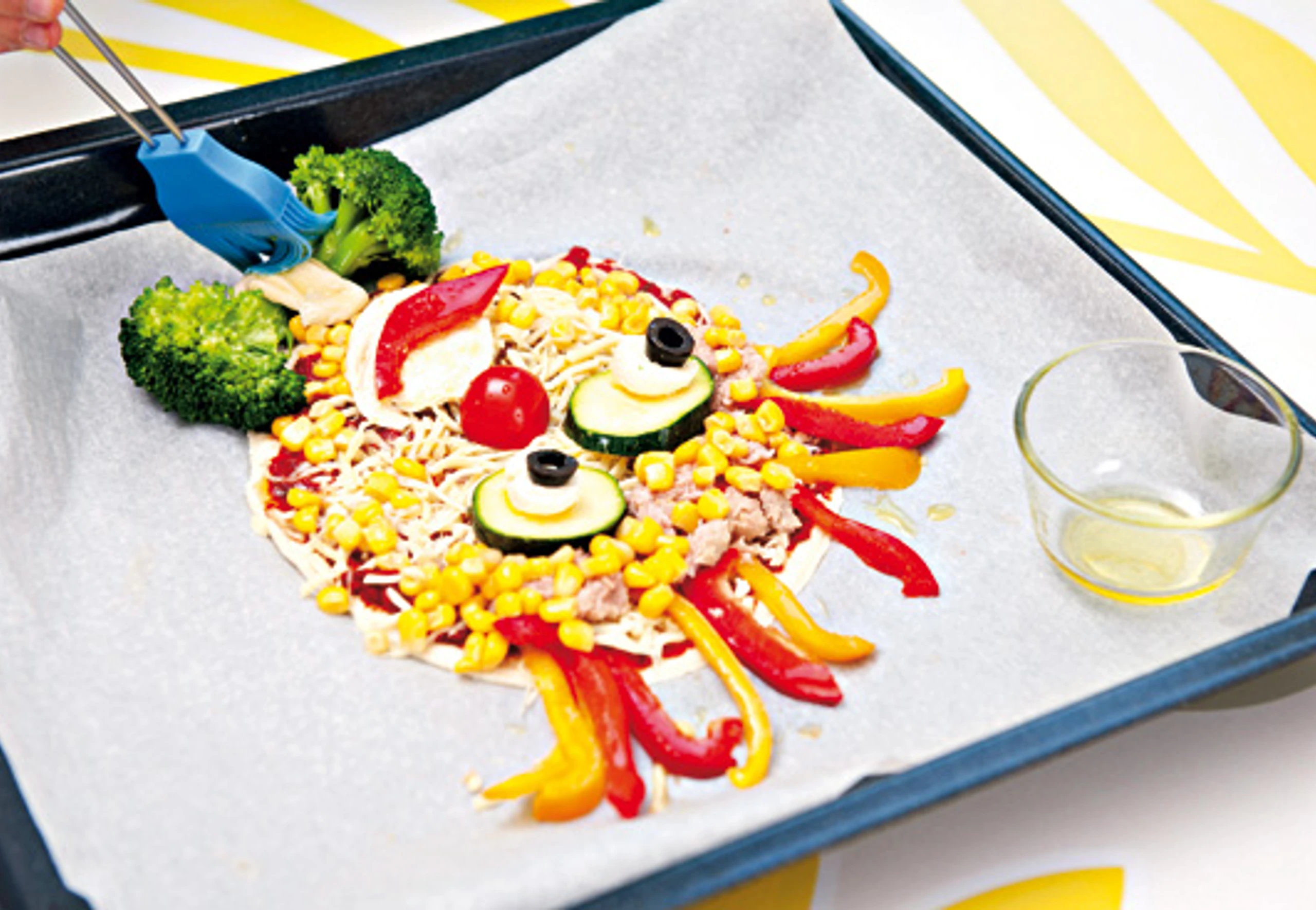 Gesicht: Aus Paprikastreifen eine Frisur zaubern. Zucchini, Mozzarella und je eine halbe Olive werden die Augen. Am Rand entlang etwas Mais streuen, Thunfisch auf die Stirn geben. Der Paradeiser wird die Nase. Brokkoliröschen und ein Teigstück zu einem Mascherl binden. Eine Mozzarellascheibe und ein Stück roter Paprika werden der Mund.