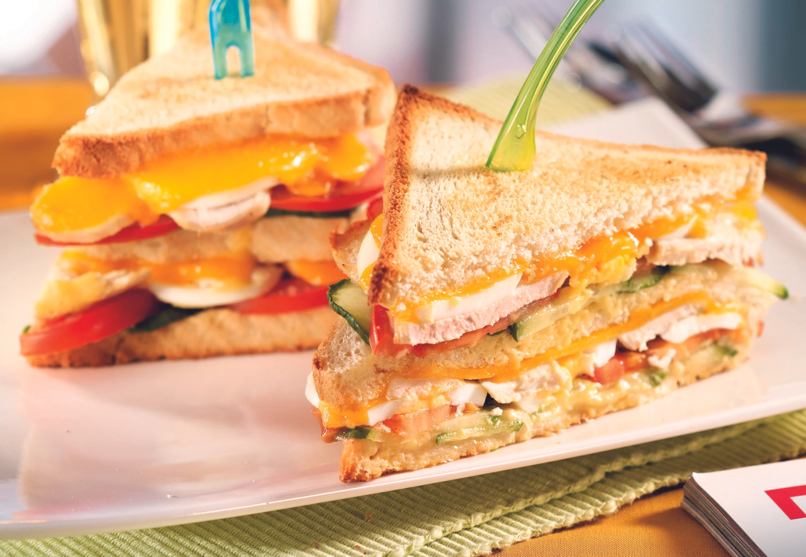 Temperatur auf 180°C er-höhen. 4 Toastscheiben mit Gurke, Paradeiser, Fleisch, Ei und Käse belegen. Mit je 1 Toastscheibe bedecken. Übrige Zutaten darauf verteilen, mit 1 Toastscheibe abschließen. Sandwiches im Rohr erhitzen, bis der Käse geschmolzen ist. Sandwiches halbieren und mit Spießen fixieren.