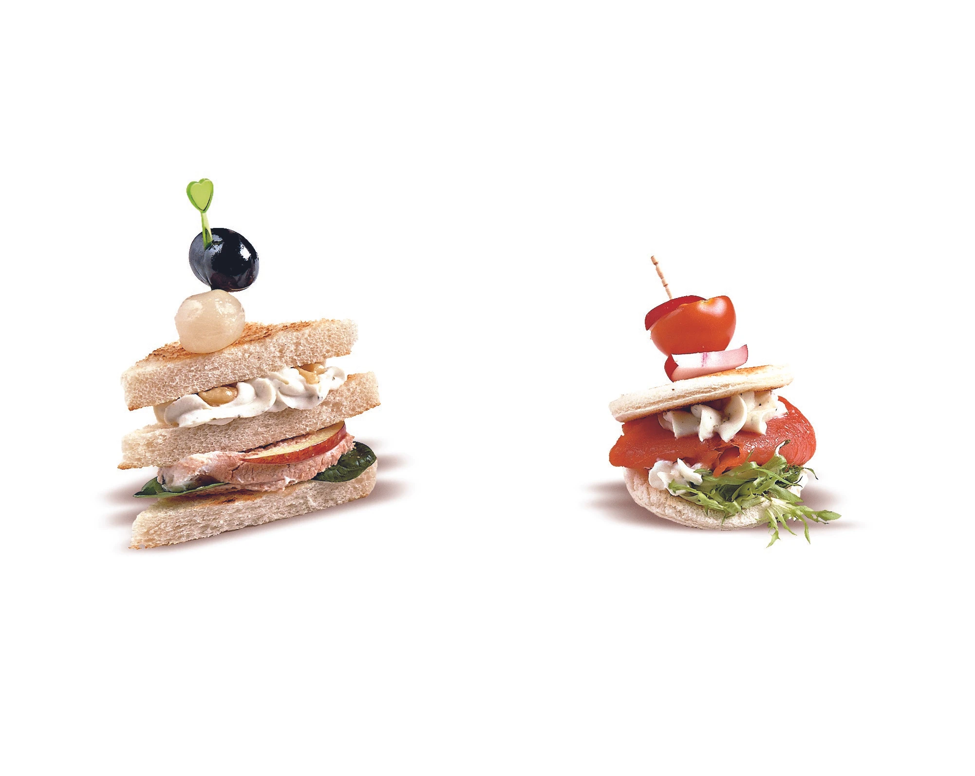 12 Brotstücke mit Salatblättern belegen und mit Käse-Lebercreme bestreichen. Weitere 12 mit Käse-Walnussmischung bestreichen, auf die Leberbrötchen setzen, mit einem Brotstück abschließen. Oliven und Perlzwiebeln auf Spießchen stecken, Brötchen damit garnieren.