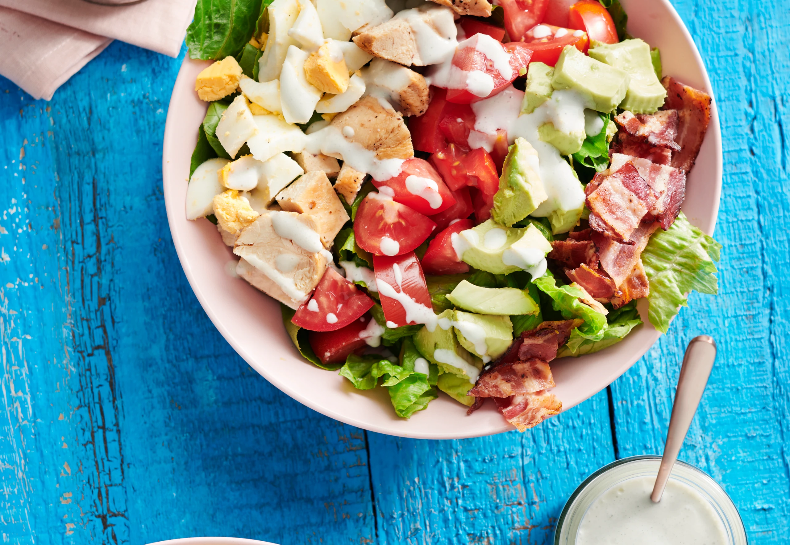Salate putzen und zerpflücken. Paradeiser würfelig schneiden. Eier schälen und grob würfeln. Avocados halbieren, Stein entfernen, Fruchtfleisch aus der Schale lösen und in Würfel schneiden. Hühnerbrüste in Stücke schneiden. Alles in Schüsseln anrichten und mit dem Dressing beträufeln.