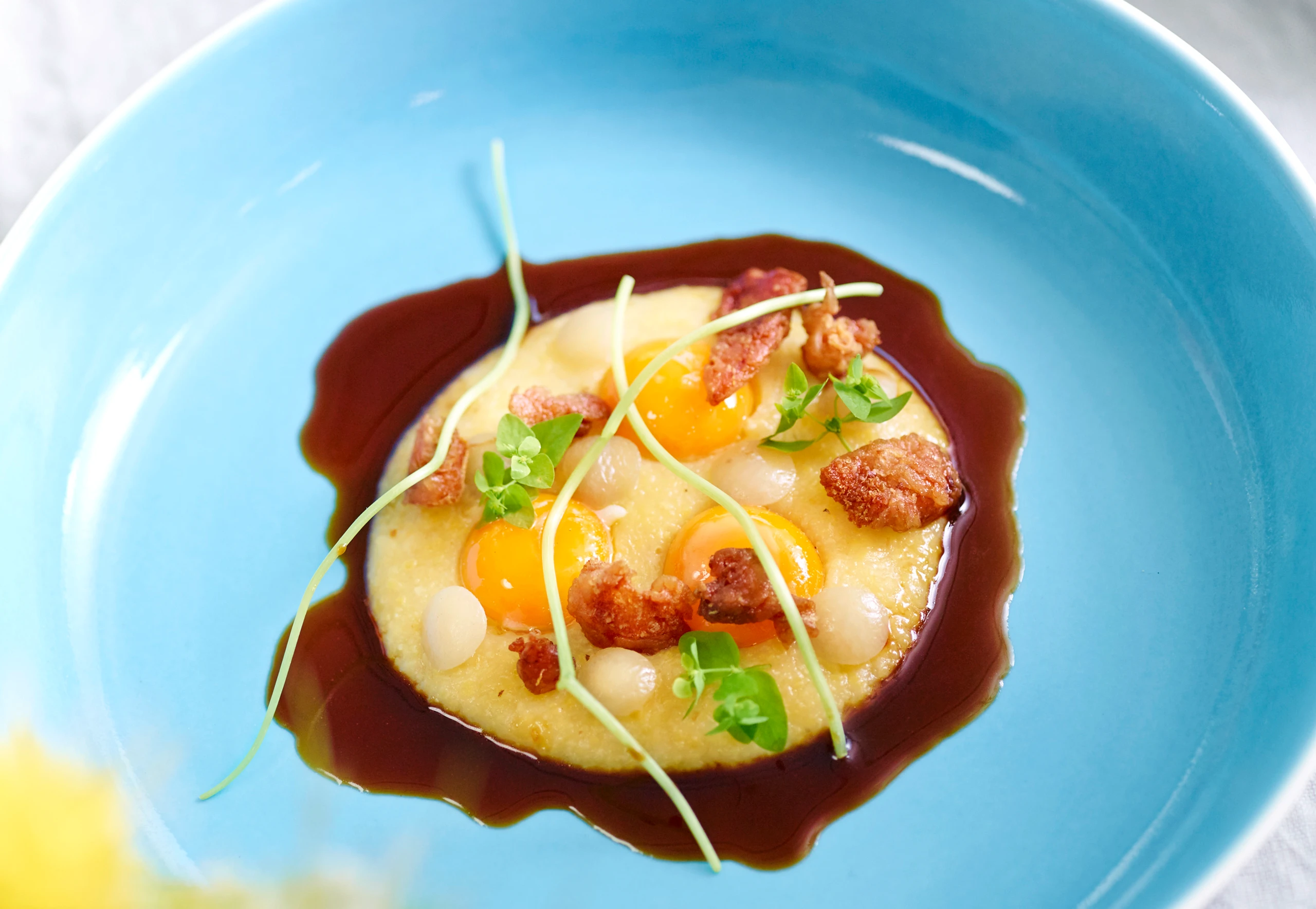 Konfiertes Ei mit Polenta und Mangalitza-Essenz