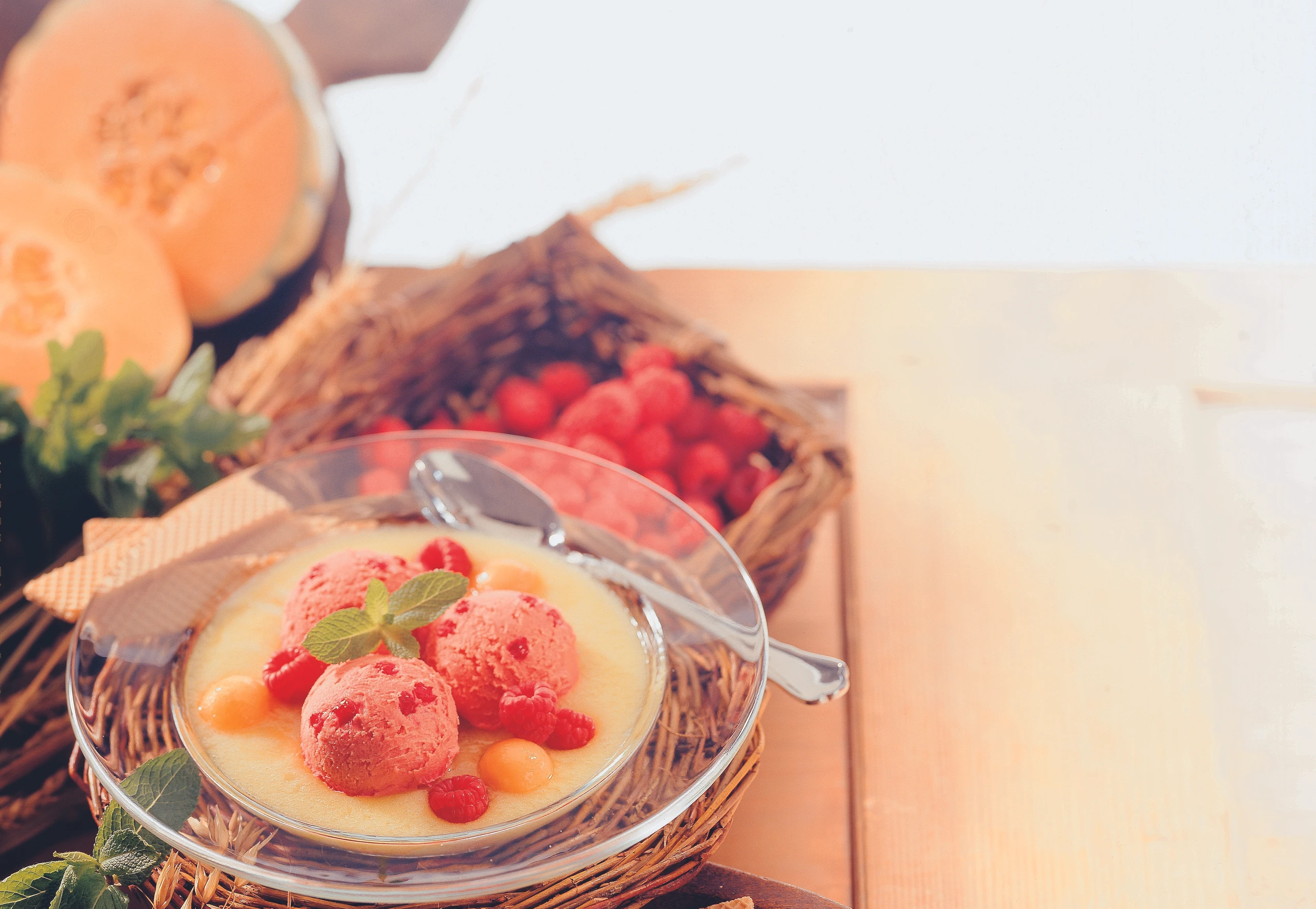 Die Melonensuppe in Suppentellern anrichten, Melonenkugeln und Himbeeren darin verteilen. Das Sorbet portionieren, in die Suppe setzen und mit Minzeblättern garnieren. Zur Suppe serviert man Eiswaffeln.