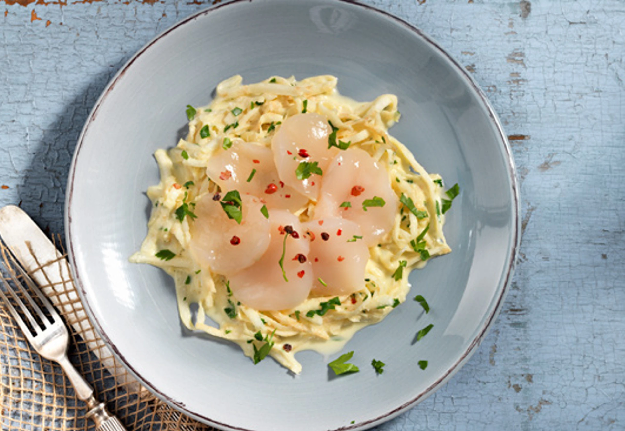 - Sellerie anrichten, Muscheln in dünne Scheiben schneiden und fächerförmig darauf verteilen. Gericht mit Rosa Beeren bestreut servieren.