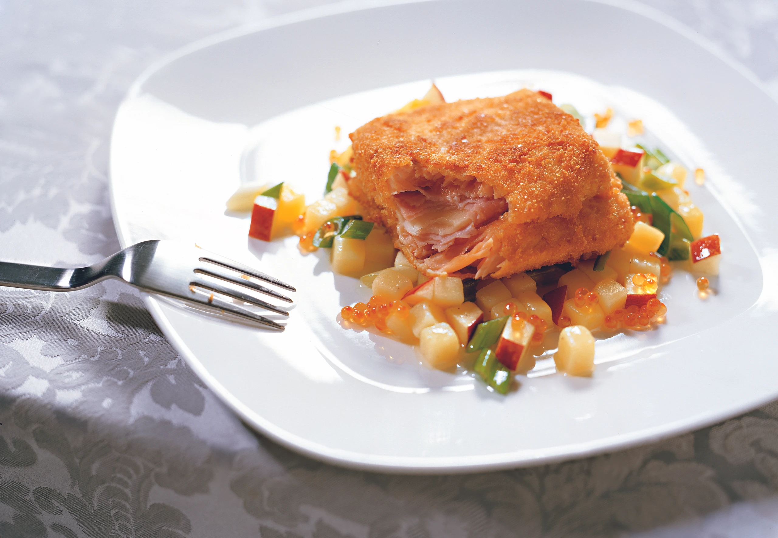 Cordon bleu vom Lachsforellenfilet mit süßem Erdäpfelsalat